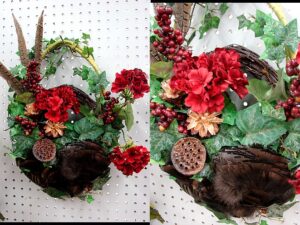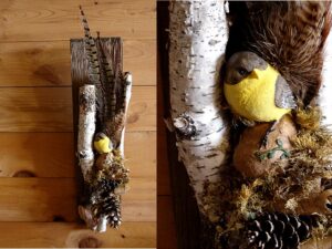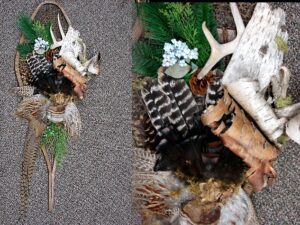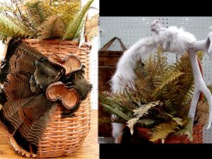 Our Northwoods Memories Collection are unique, one of a kind, simple reminders of your last slow walk through the Forest. Memories gathered together and artistically displayed in Deer Antler arrangements, Grapevine Wreaths, Birch Bark Canoes, Antique Cabin Decor and anything else that will gracefully display a good dose of nature. Hand crafted with Birch Bark, Deer Antlers, Pheasant and Wild Turkey Feathers, Pine Cones, Forest Moss, Birch Fairy Shelves, Milk Weed Pods, Silk Greenery, Pine Boughs, River Rock and other forest treasures. Most of these supplies can be purchased separately on our Craft Supplies page. Contact us mooserus@moose-r-us.com if you would like an arrangement made to your specifications. Arrangements with an Add to Cart button that are marked Sold can be re-created with slight variations and a one week turn-around time frame.