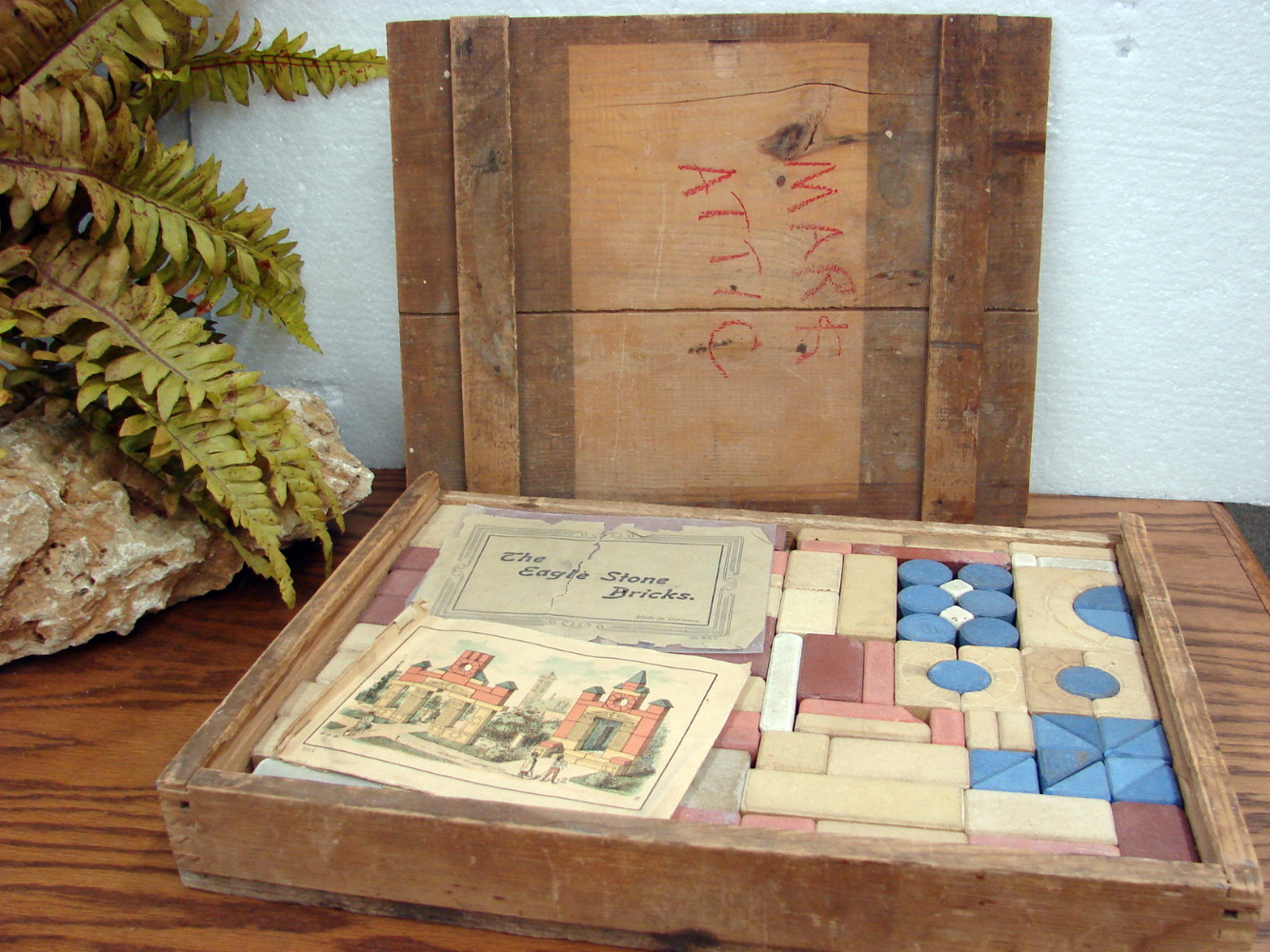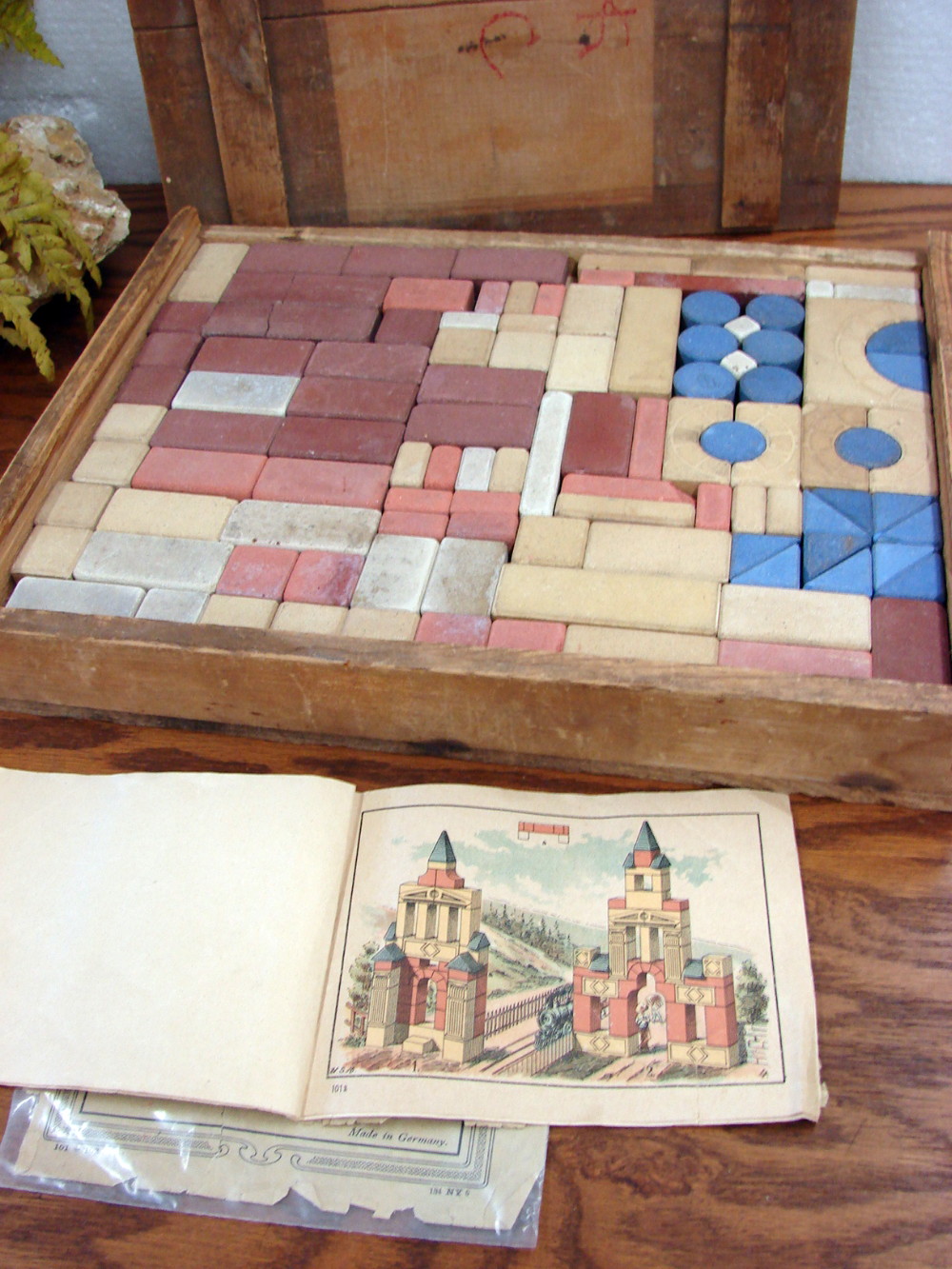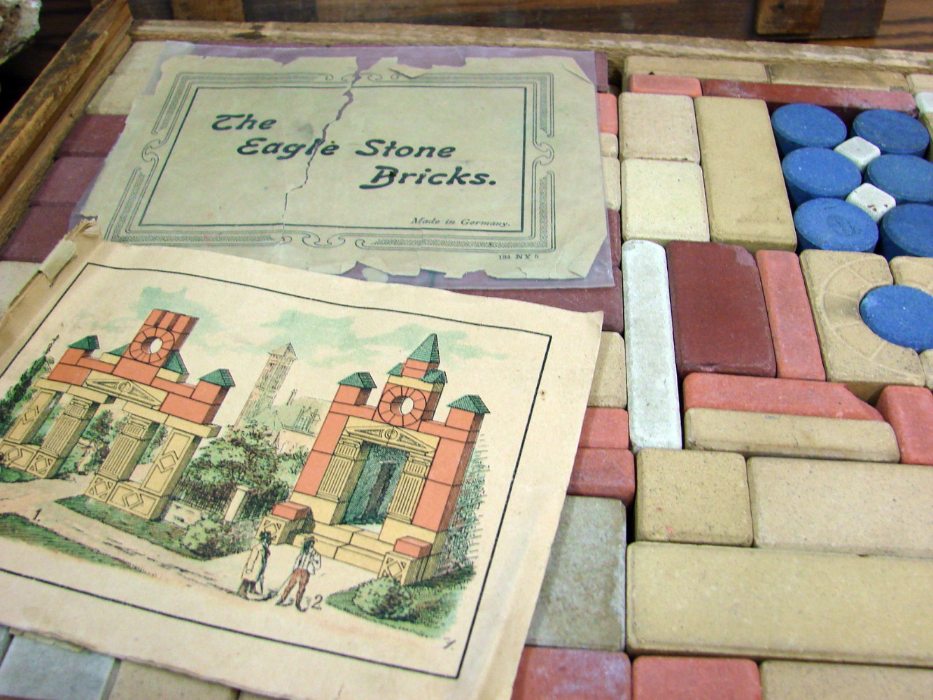 Very cool, very old Stone bricks for building. Complete with booklet (worn) showing everything you can make and original wood box to store them in. Box shows wear of course, but blocks looks to be in exceptional condition considering their age.