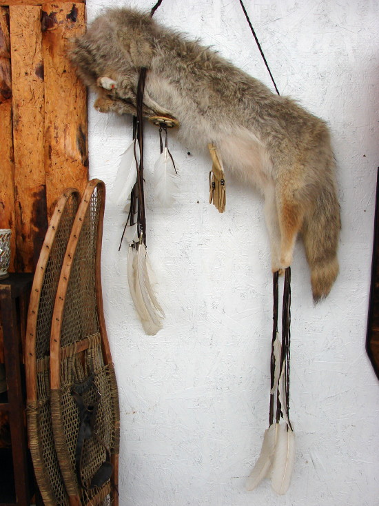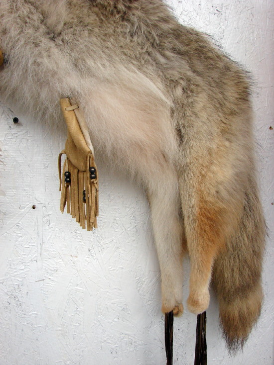 Authentic real Grey Fox full body pelt made into an over the shoulder arrow quiver complete with medicine wheel and medicine pouch to protect the Warrior in battle. Comes complete with Certificate of Authenticity and two arrows each. Grey Fox measures about 27″ long by 58″ tall. Beautiful workmanship and looks awesome on the wall of your log home. Authentic craft of the South West Navajo.