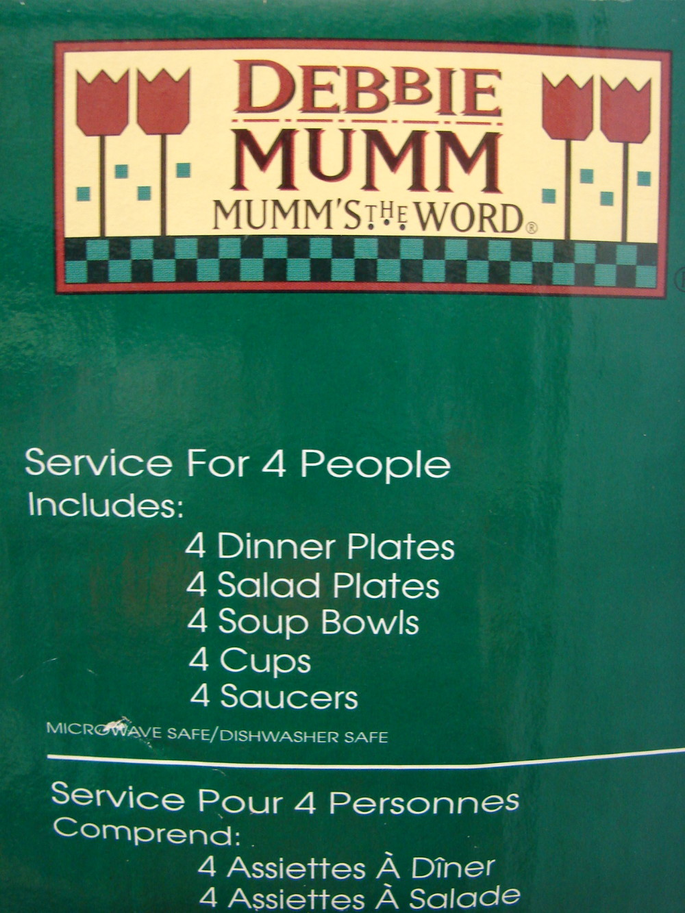 Brand New 20 Piece set of Debbie Mumm retired Stoneware Joy to the World dinnerware set. A Service for Four. Includes Four Dinner Plates, Four Salad Plates, Four Soup Bowls Four Cups and Four Saucers. All brand new, never used. Box shows shelf wear. Awesome set and it doesn’t get any nicer than this. Two sets available.