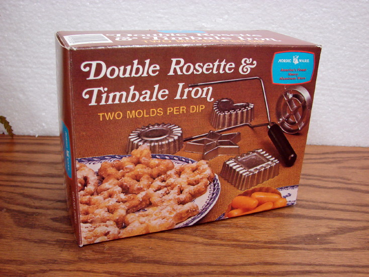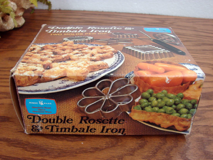 Vintage boxed Nordic Ware set of Rosette and Timbale Iron includes recipes and mold options (Rosettes=open forms, Timbales=closed forms). Perfect for your Scandinavian Treats and deserts. A must have for your kitchen. Yum! This one is a Brand New 4 mold in the colored box. Mold style will vary. Many more options also available.