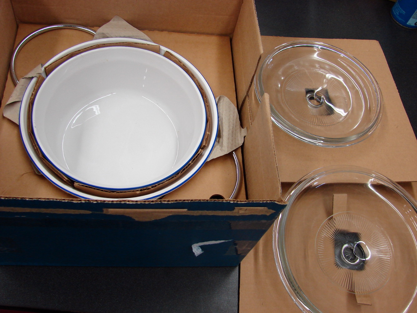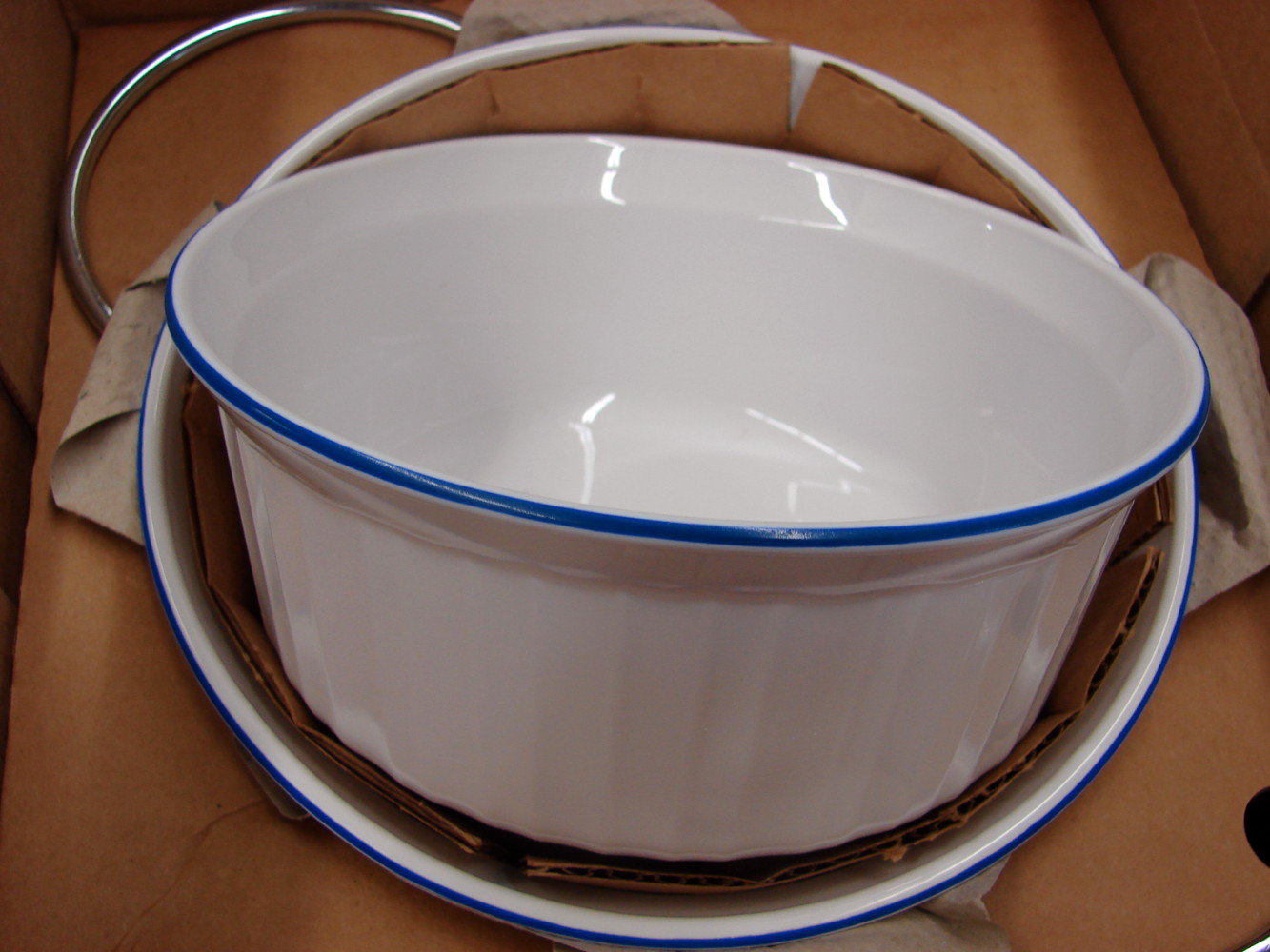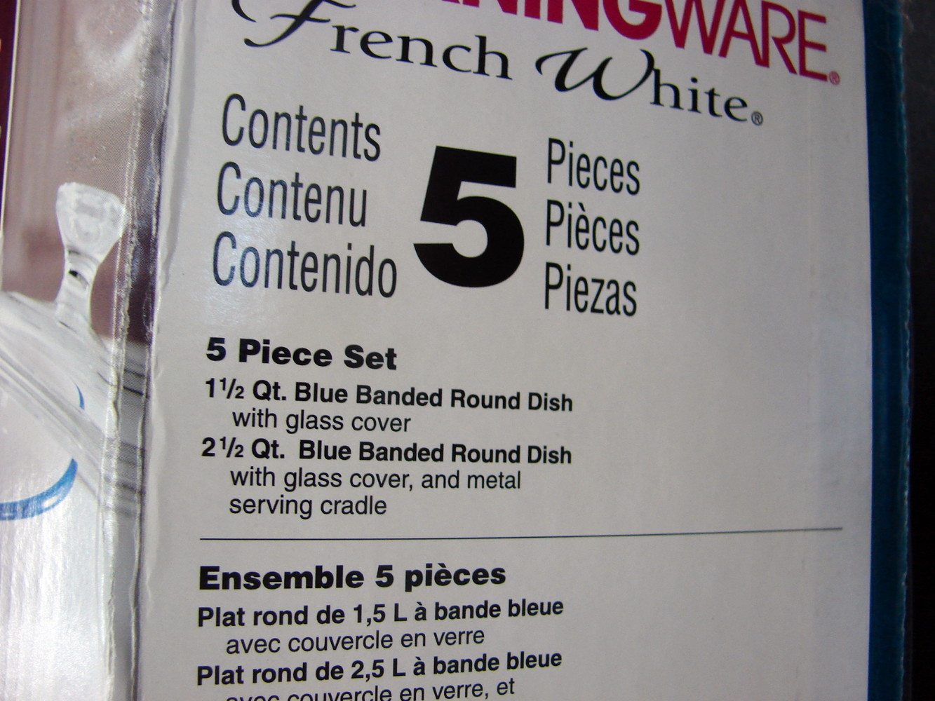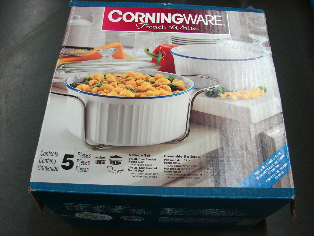 Brand new CorningWare French White with Blue Band 5 pc set. Includes 1 1/2 quart round casserole with Lid and a 2 1/2 quare round casserole with lid and metal serving cradle. Never used.
