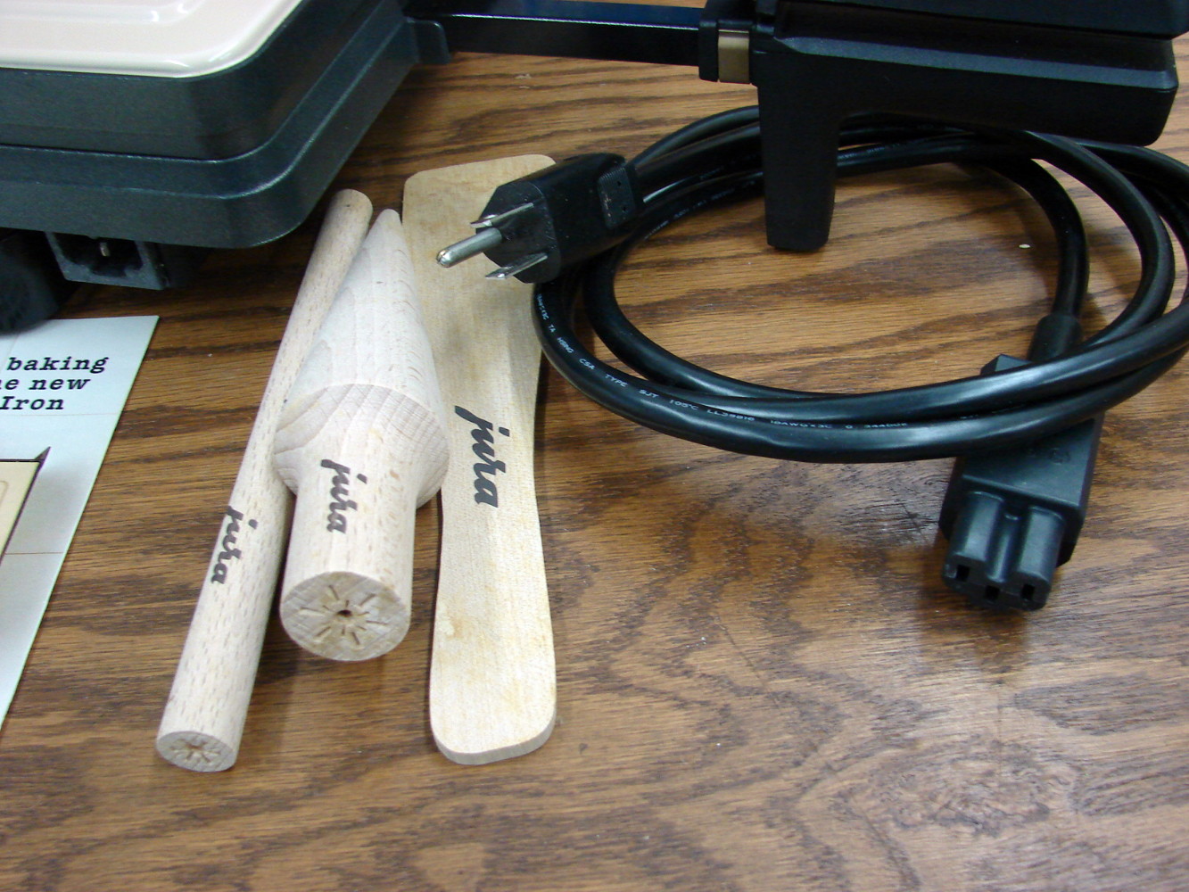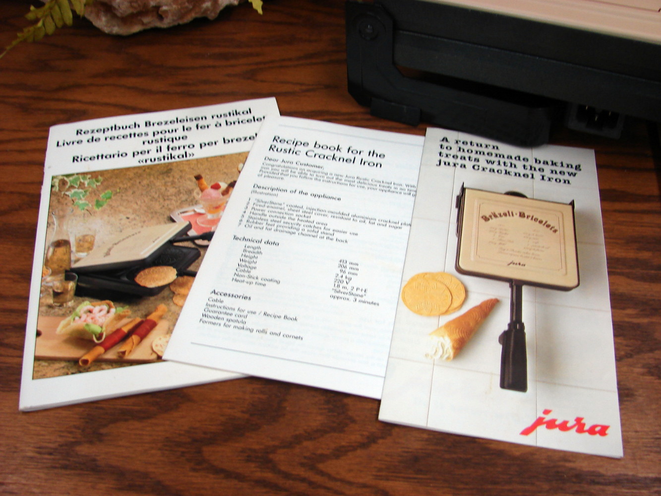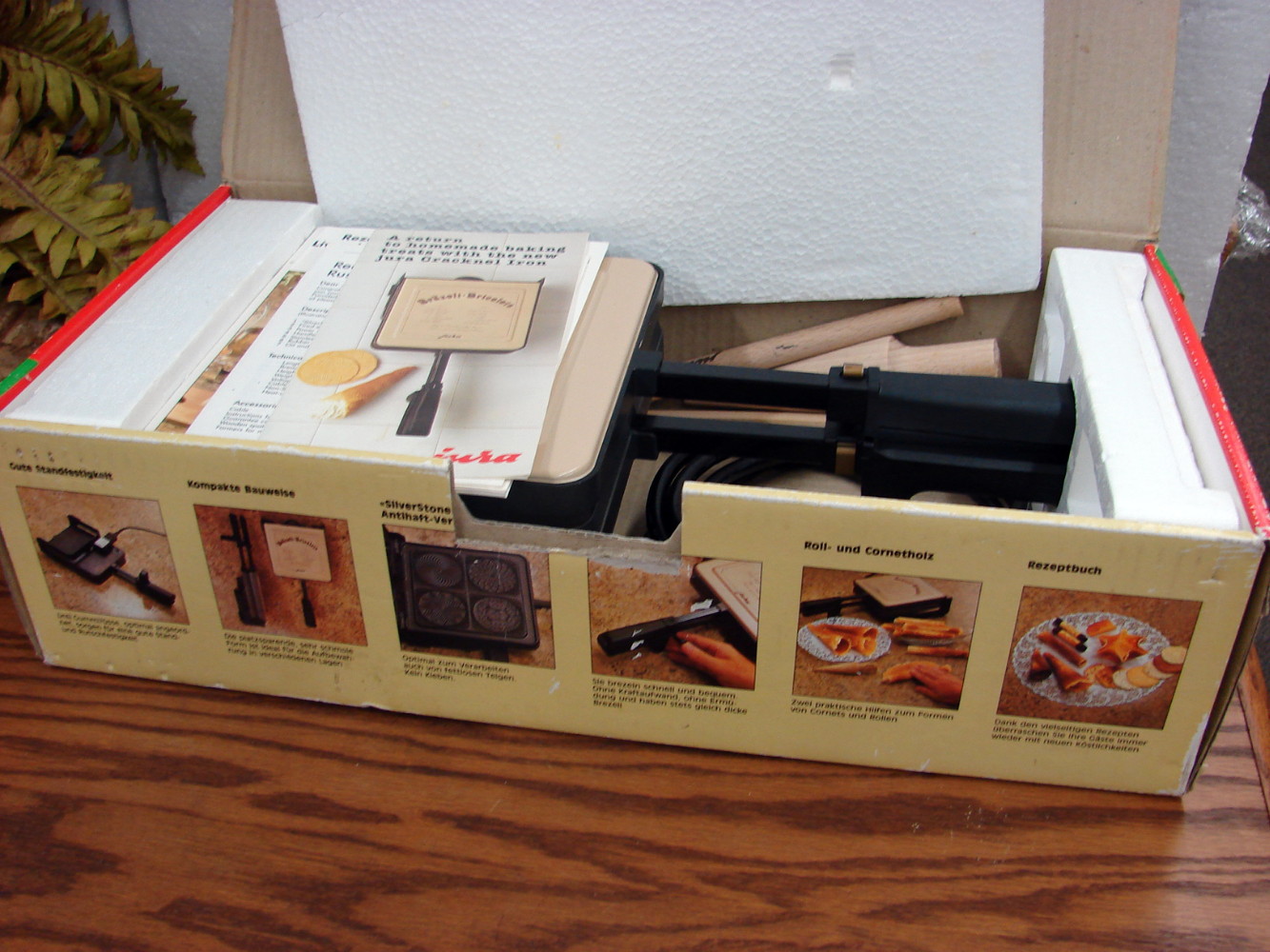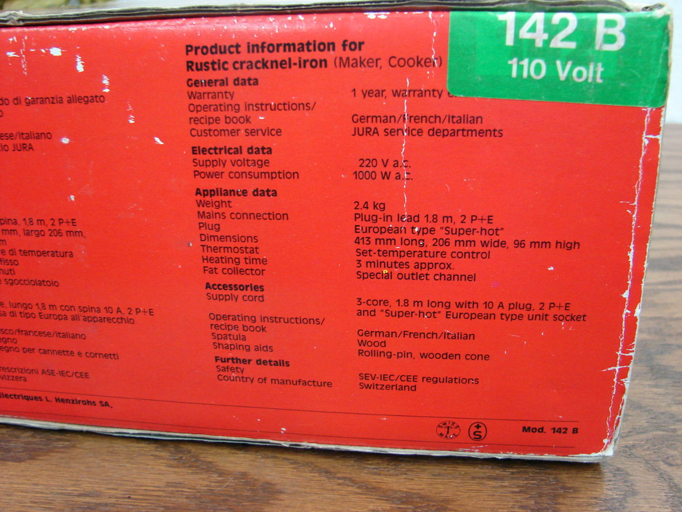 Make your authentic Swiss Cookies and Scandinavian Krumkake with this Brand new (we believe, we are not the original owners) in original box Jura Brazeleisen Model #142 110v wired electric Waffle Cookie Iron. Includes 3 recipe/instruction booklets- one in English, 3 turners/cones and was made with a 110 Volt Power Cord. (see box sticker). Works as intended-heats up fast and ready to become your favorite Holiday appliance for generations to come. Get it while you can, they do not make these beauties anymore.