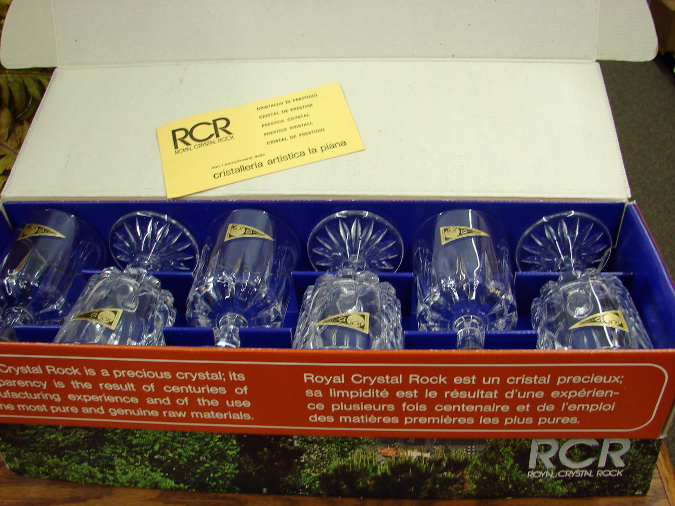 Gorgeous Brand New Vintage Royal Crystal Rock Italy Crystal Stemware in original boxes.   This set is a set of 12 (two boxes) of 5 7/8″ tall by 3″ wide Water Goblet with original stickers on each glass.   Free from damage.