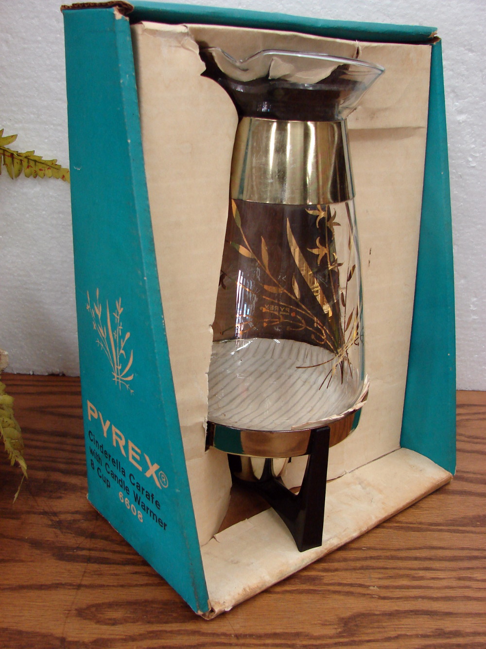 Brand New Vintage PYREX Cinderella Carafe with Candle Warmer 8 Cup #6608 with Gold Accents. Some wear on the front from being stored and it does not sound like the brass knob for the lid is still in the box-otherwise, we do not believe it was ever used. More options like this also available.