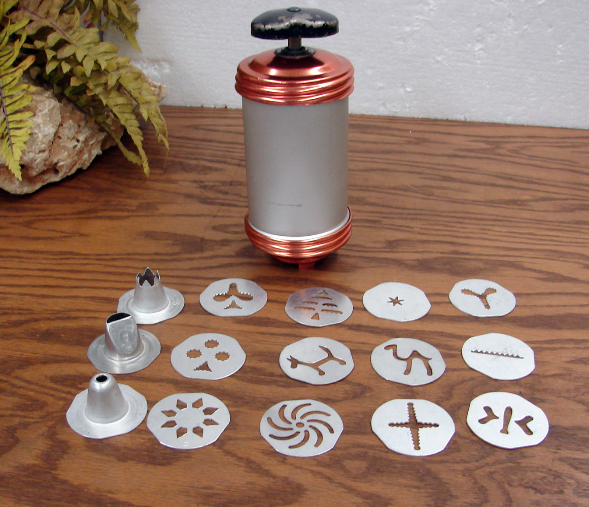 Complete Mirro #358 Cookie Press (with fat reservoir for large cookie dough loads) includes 12 Discs and 3 Pastry Cones. Copper and Black accents, black knob paint is probably chipping as they all do. Can easily be repainted. Multiple other Mirro Cookie Presses also available.
