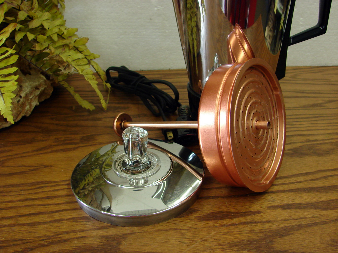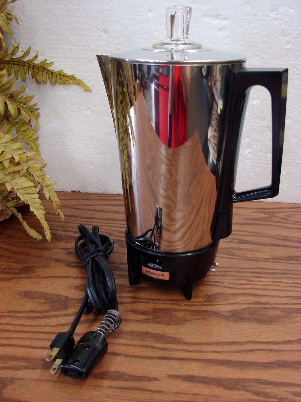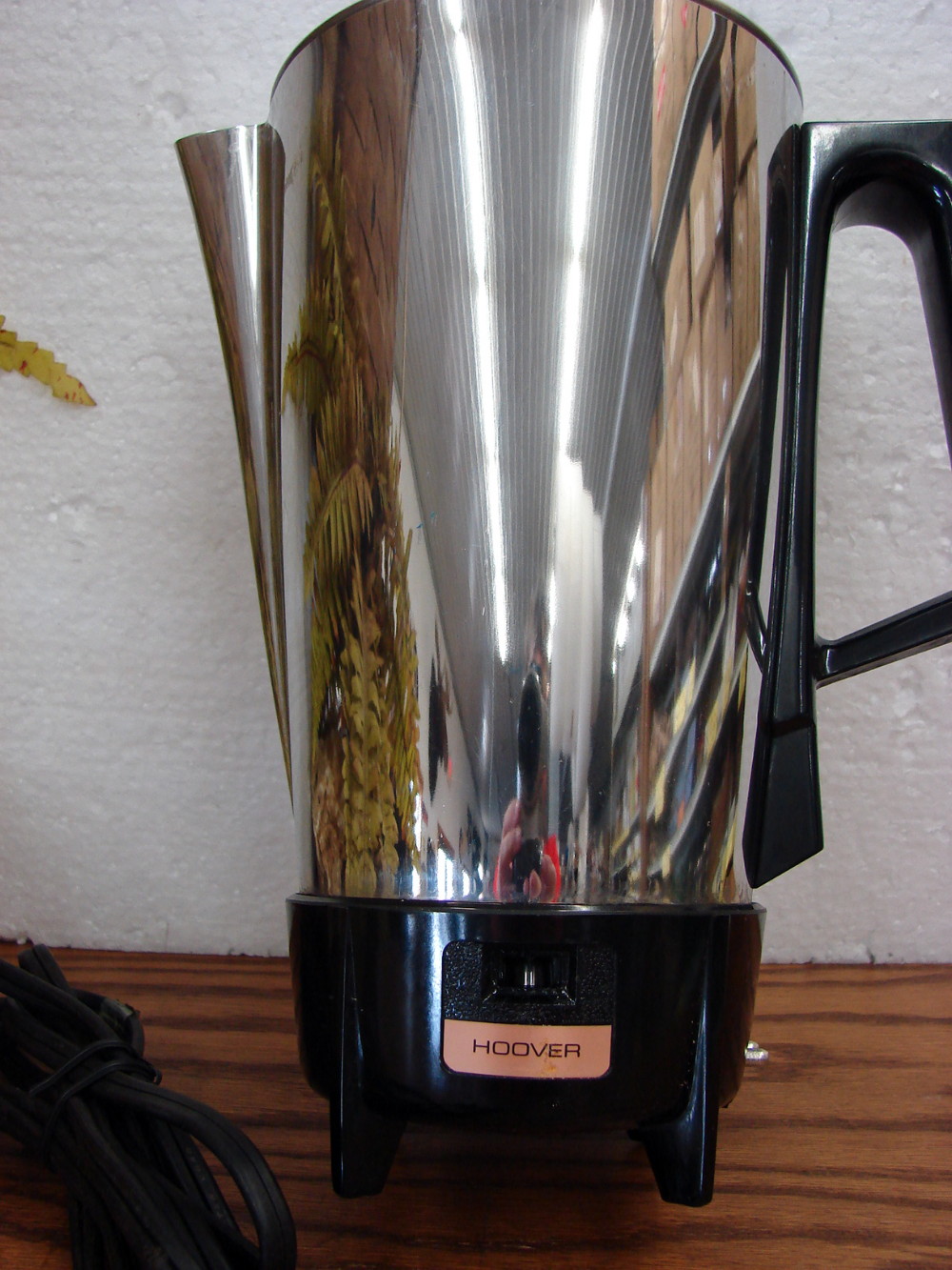Beautiful vintage Hoover Electric Coffee Percolator with a Rocket shape. Clean and works as intended. Model 8800. Free from damage, some normal light usage wear. Not sure as it works as it is but seems it should have some protective film over the ready light. Catch a peek at that awesome huge flat filter assembly, making sure you get all the good drops of coffee. Tested and working.