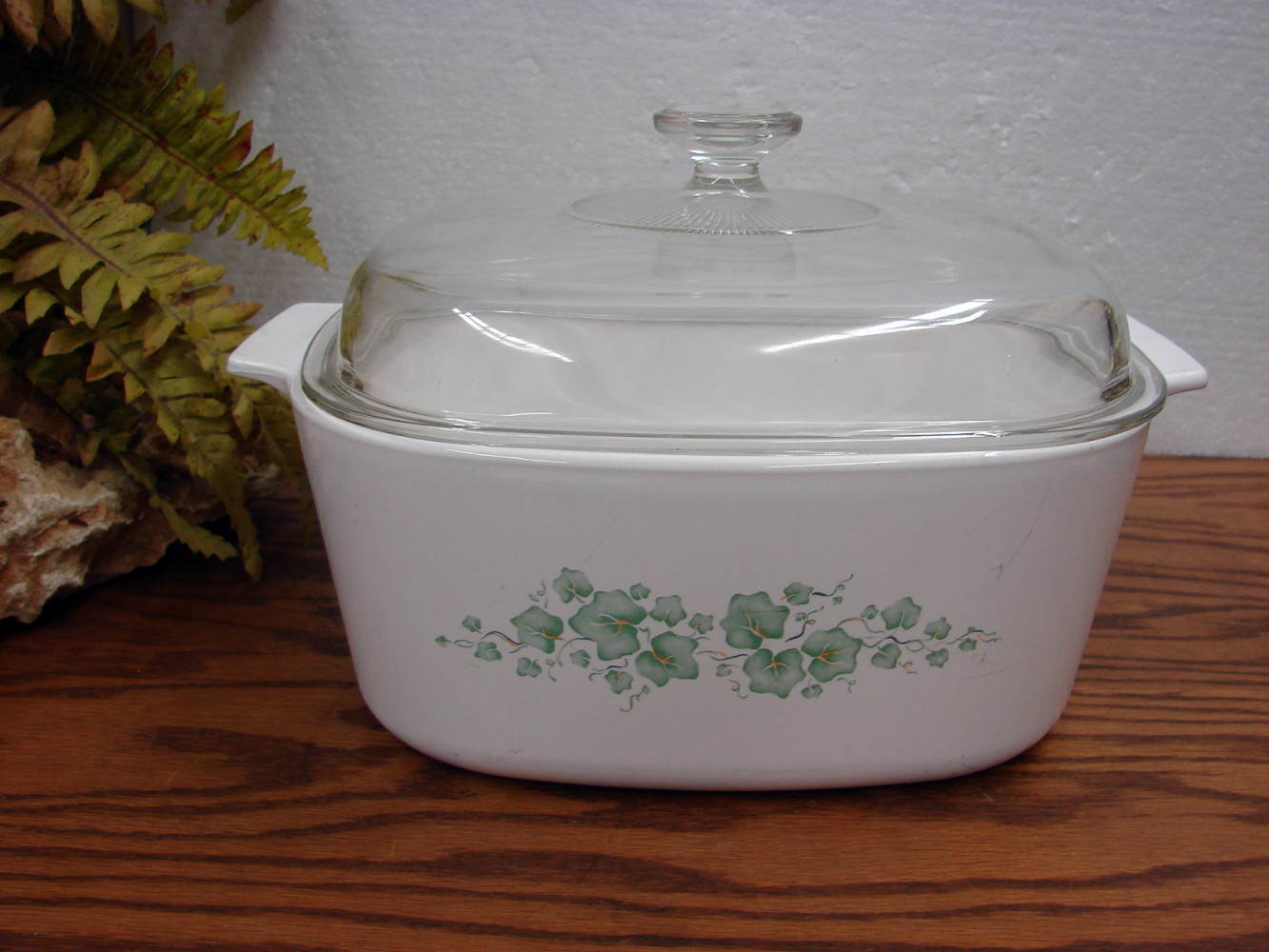 Vintage Corning Callaway pattern Green Ivy Casserole w/ Pyrex Lid that holds about 5 Quarts.   Free from damage.   More Callaway Pattern Dinnerware and Casseroles also available.