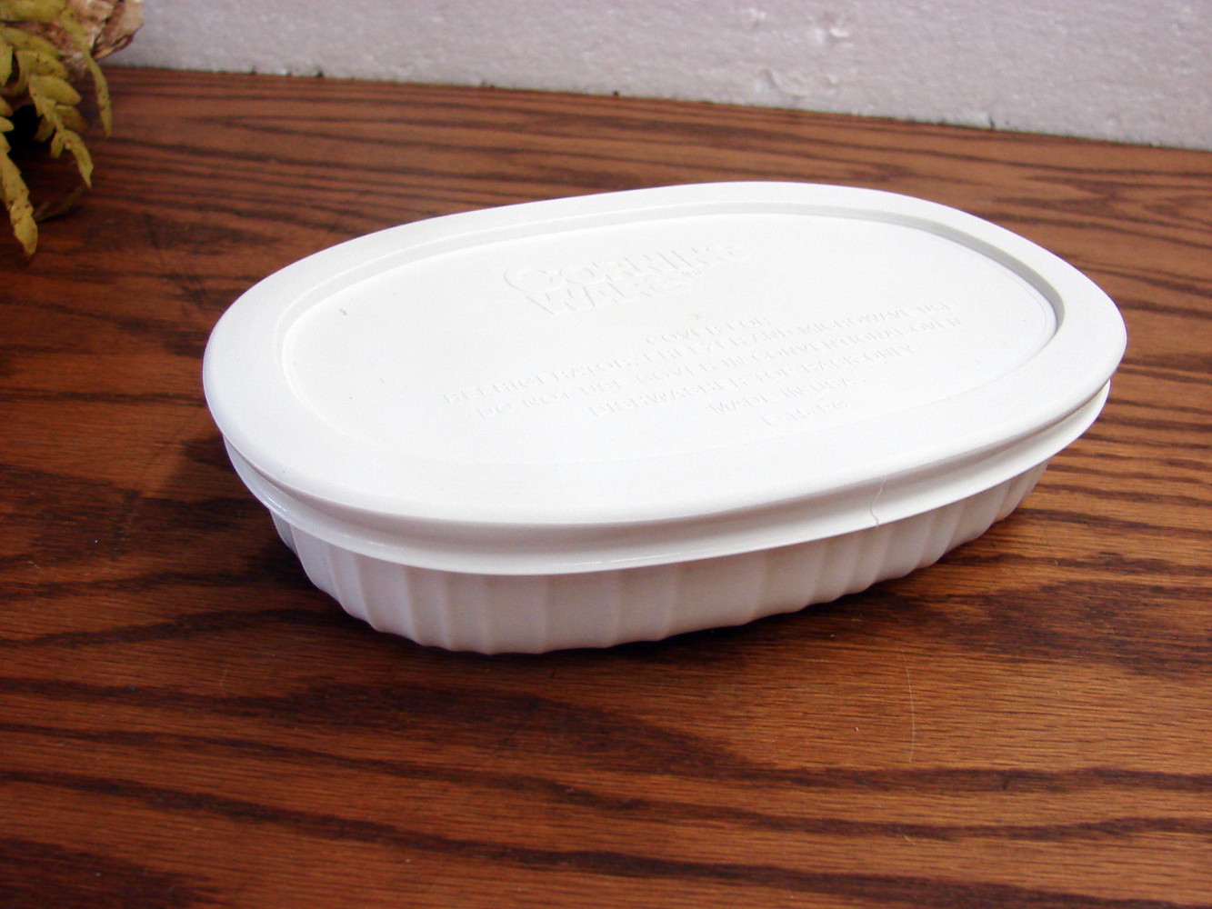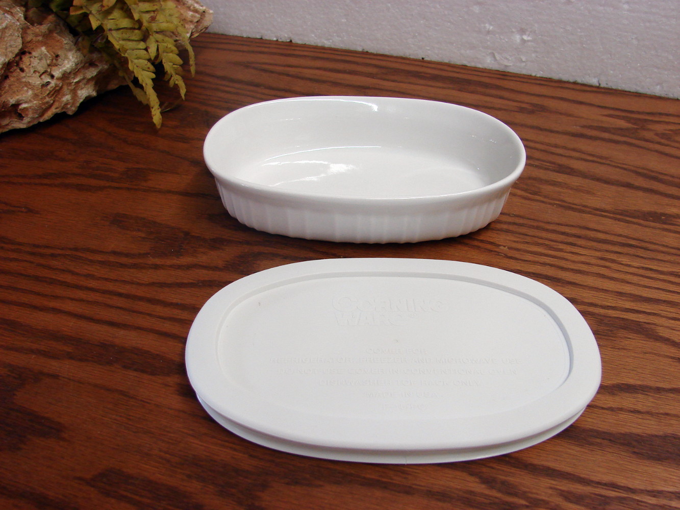 Corning Ware French White Bake Microwave Serve and Store. This is the F-15 15 oz Oval prep serving dish with storage lid. Free from damage with soft supple vinyl lid. Many more options in this style also available.