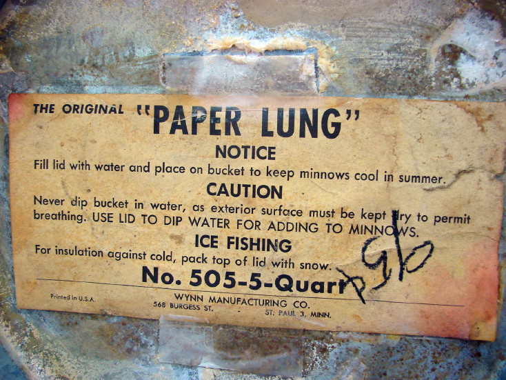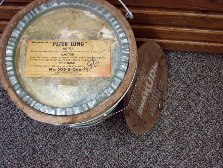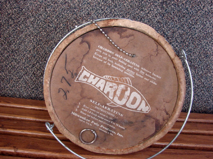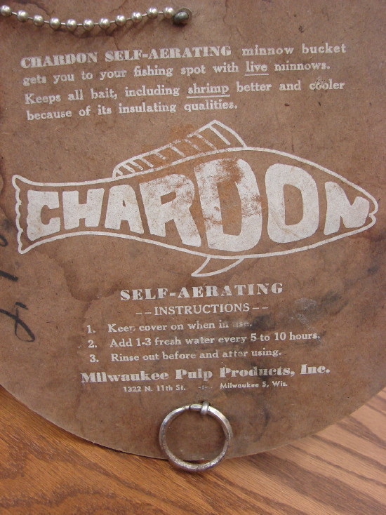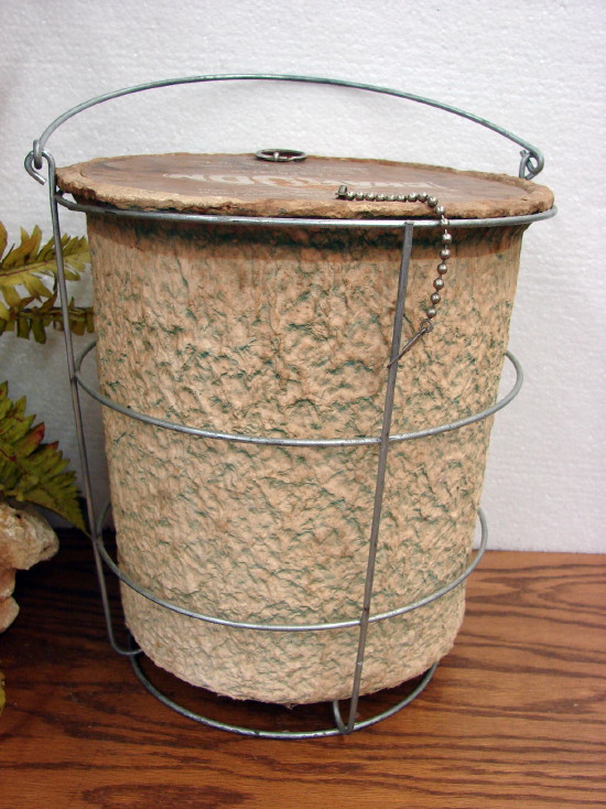 Awesome Chardon Bait Minnow box with wire frame, Paper Lung and chain on lid. Made from paper pulp and is in great condition for its age and hard to find complete. Measures about 11 1/2″ tall by 10 1/2″ wide not counting the bale handle. Nice piece!