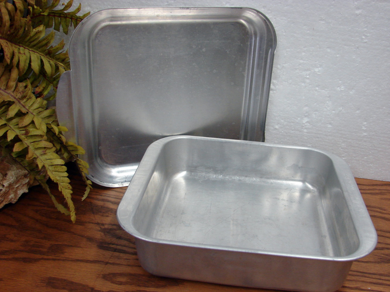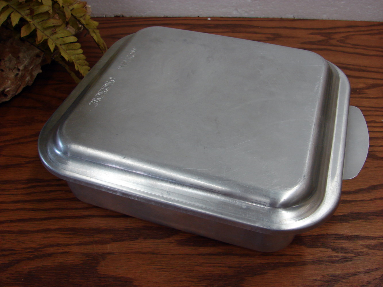 NordicWare Aluminum Square 9 x 9 covered cake pan that would be perfect for Brownies. Little bit of wear but still a lot of life left. Snap on lid. Holds about 3 1/2 Quarts.