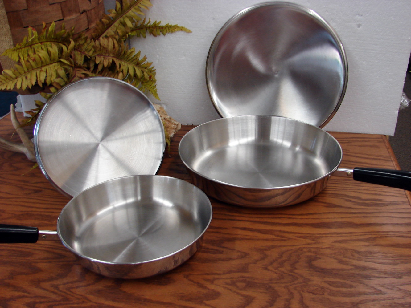 Beautiful well made quality from Revere Ware Stainless Steel Professional Pans. This one is the 9″ Skillet Fry Pan with matching Lid. Many other Revere Ware Copper bottom options also available.