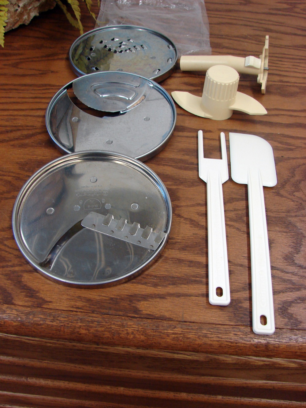 Replacement blades and spatulas for Model DLC-8 Cuisinart Food Processor. Includes DLC-837 medium, DLC-844 4mm, DLC-836 6×6 mm, DLC-8 Dough Blade, DLC-849 Adapter, Nylon Spatula and Spatula/Blade Reamer. All free from damage and look like new.