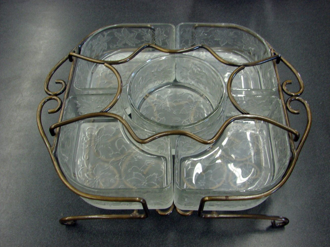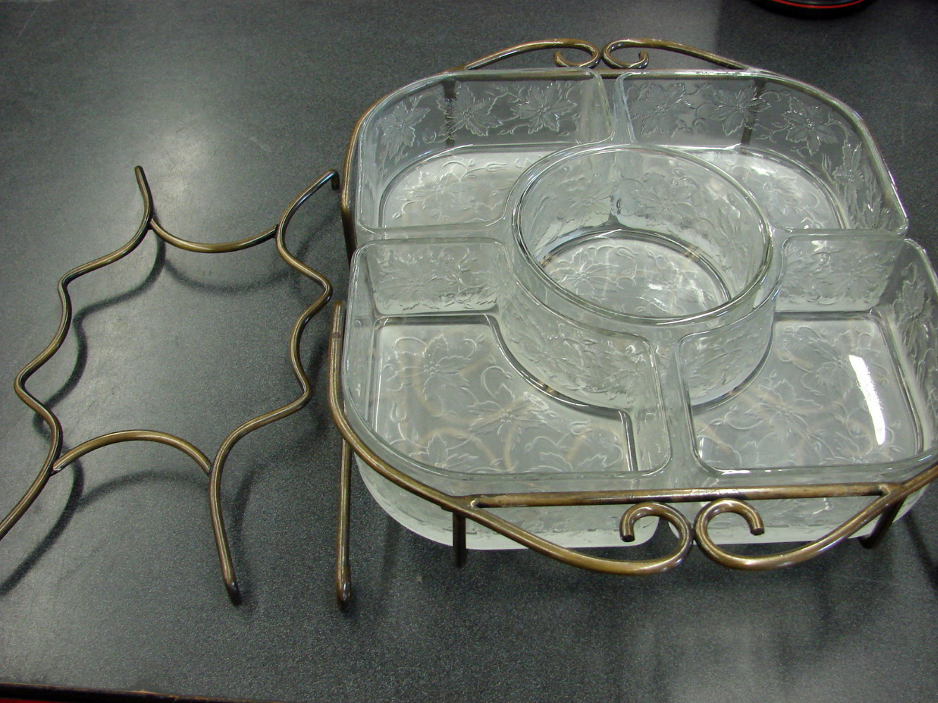 Retired Princess House Fantasia Raised Relief Frosted Crystal Poinsettia 7 Pc Chip Dip Veggie Tray with Meridian Metal Rack. Free from damage. Never been used. Measures about 11 1/4″ square. Many more options of Fantasia also available.