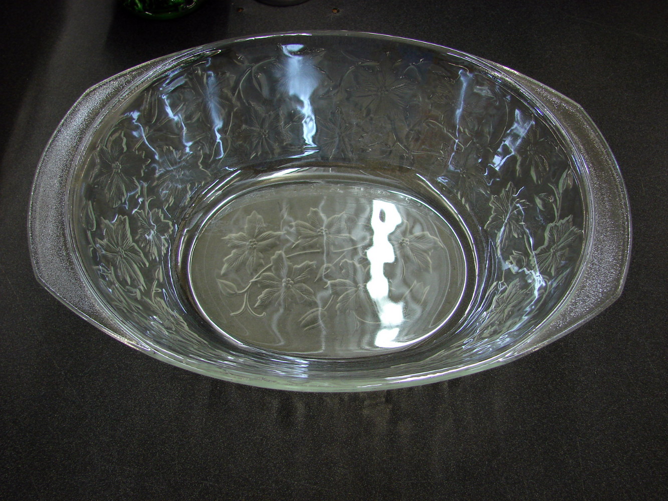 Retired Princess House Fantasia Raised Relief Frosted Crystal Poinsettia Deep Oval Serving Bowl.  13 x 9 x 2 3/4″ not counting handles.  Faint scratches on inside bottom.  Many more options of Fantasia also available.