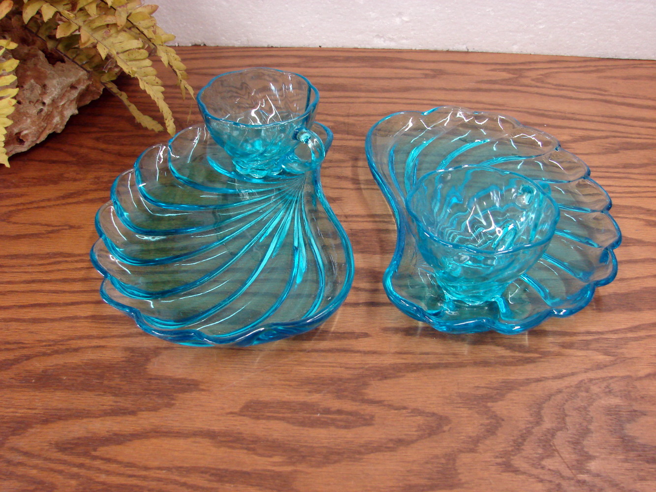 Set/2 Vintage Hazel Atlas Capri Colonial Blue Aqua Seashell Snack Plates and Cups