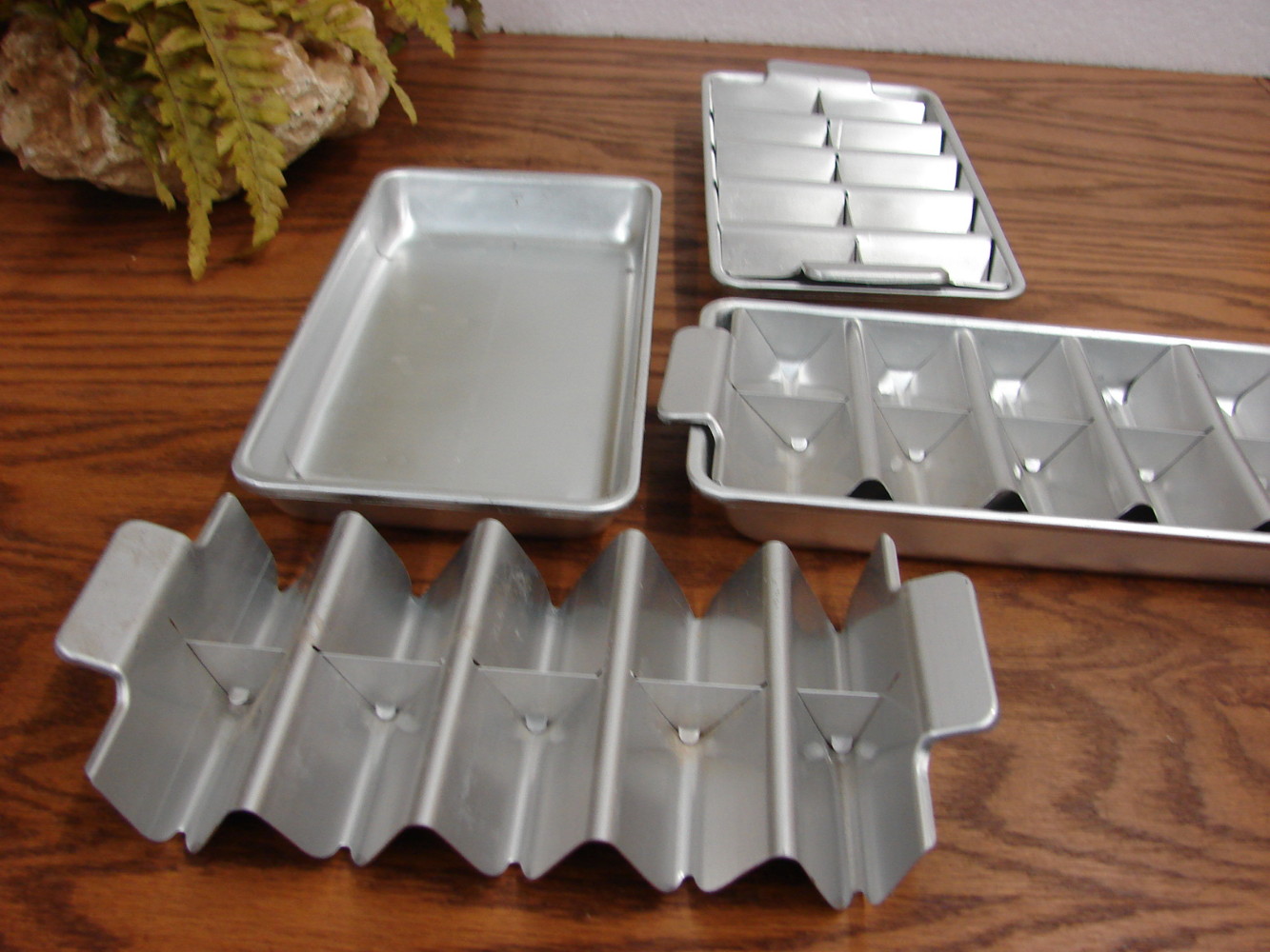 Set/3 Vintage Aluminum Old School Ice Cube Trays. Matching V Shaped Cubes.  Normal wear and dings.  Work as intended.   Measures about 9 x 4 3/4″.  Many more old school ice cube trays also available.