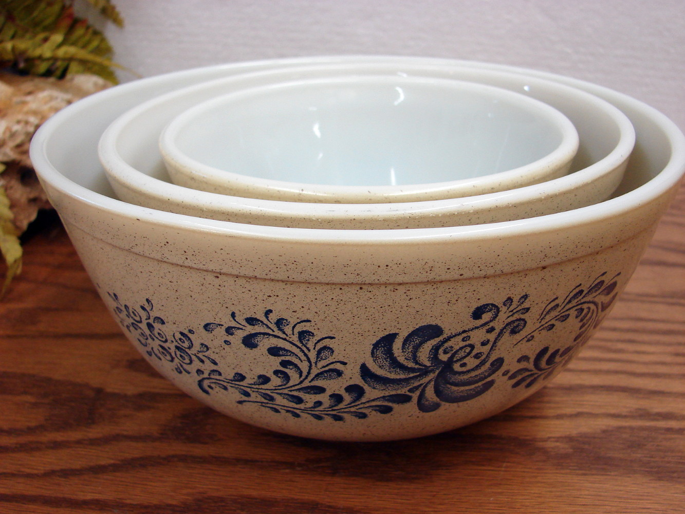 Set of three Vintage PYREX Homestead Blue Pattern #401, #402 and #403 Round Nesting Mixing Bowls. Hold about 1 1/2 pint to 2 1/2 quart. Little to no wear. Many more options in this pattern also available.