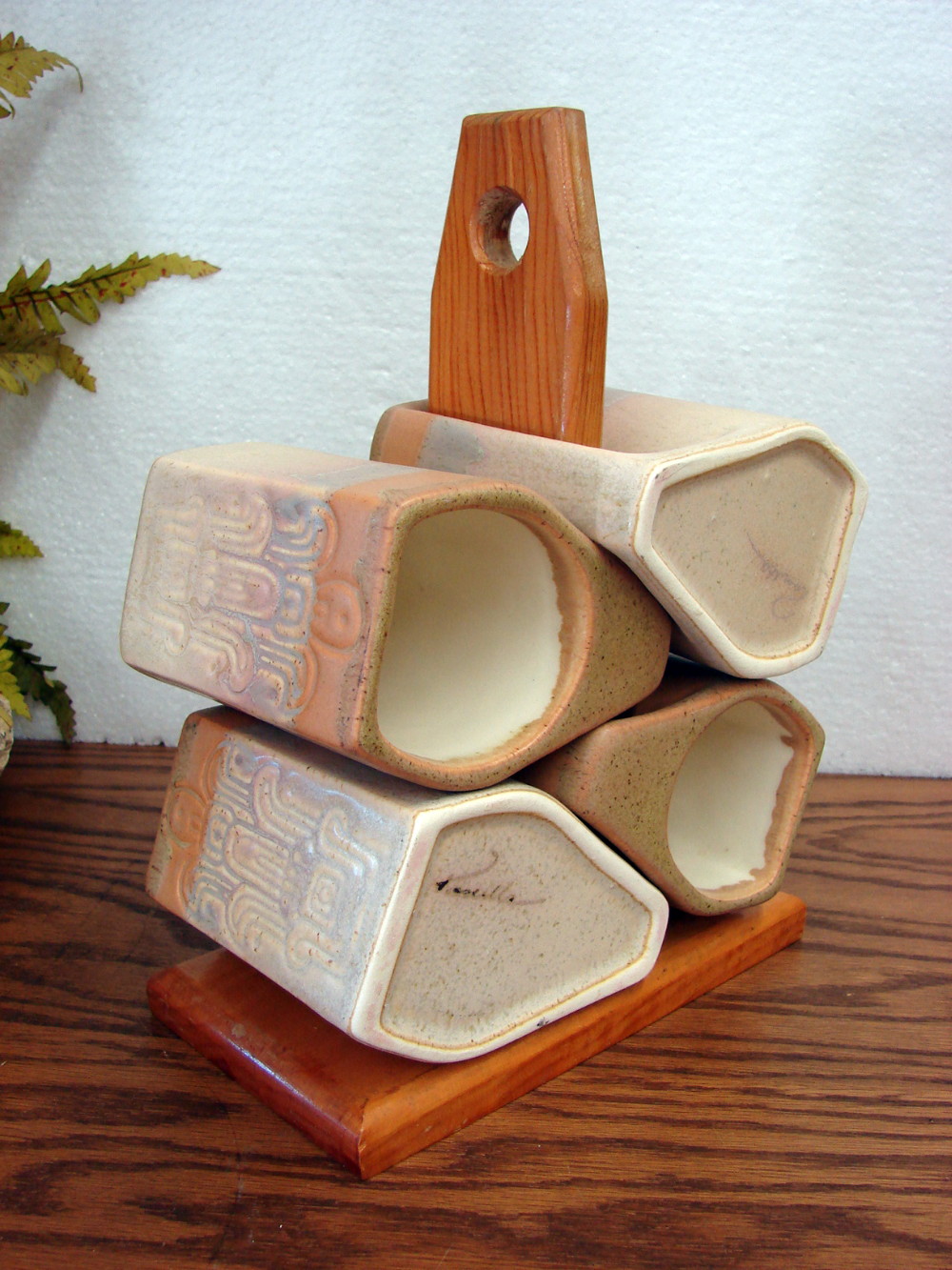 Beautiful stoneware with drip glaze made in Mexico. Rodo Padilla is known for his eye for color, and quality workmanship. These are very user friendly oversized heavy mugs with wrap your hand around handles and perfectly heavy duty for the cabin. No chips, cracks or repairs. This is a set of Pastel Natural Colored Aztec Design with wooden stand. Beautiful glaze and Mold. More Padilla Stoneware options also available.