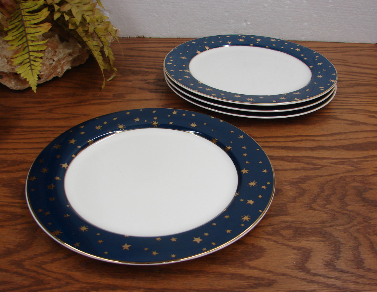 Set of four Navy Blue 14 carat Gold Trimmed dinner plates. Each measures about 10 5/8″ wide. Never have been used as far as we can tell. Perfect for Holiday or every day use. More Sakura Pattern options also available.