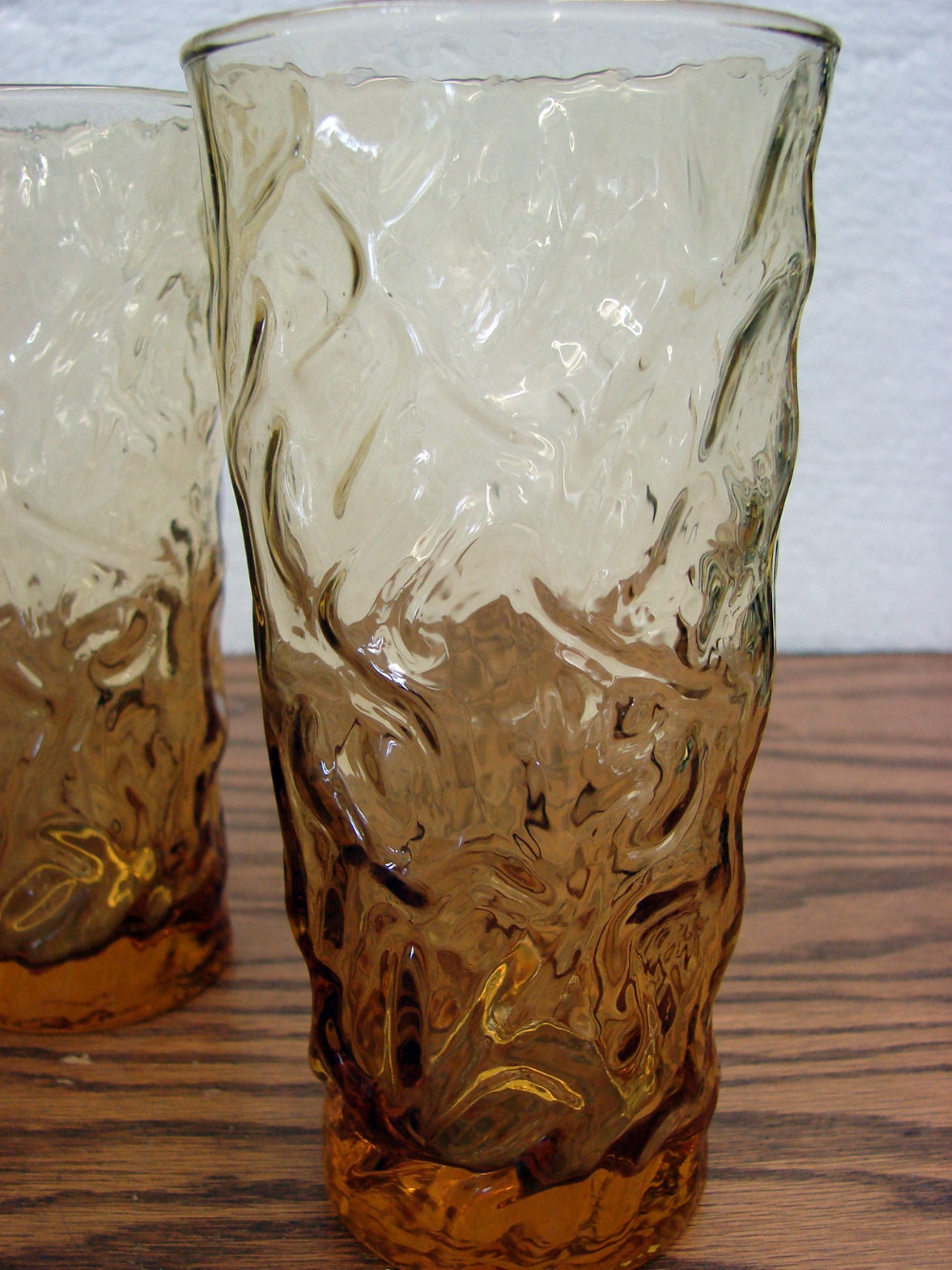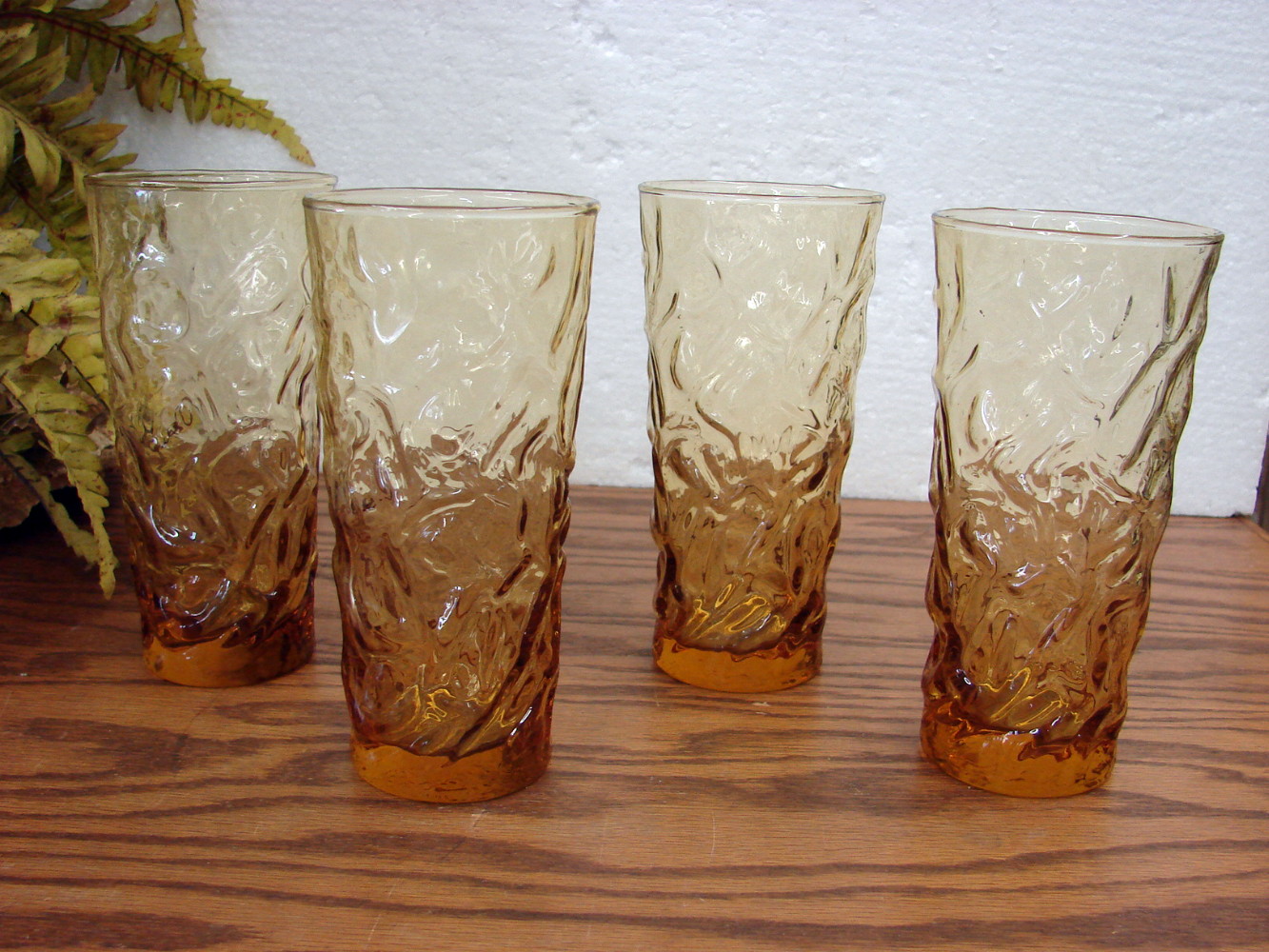 Set/4 Vintage Anchor Hocking Honey Gold Lido Milano Ice Tea glasses that measure 6 3/8″ tall and hold about 16 oz. Free from damage.