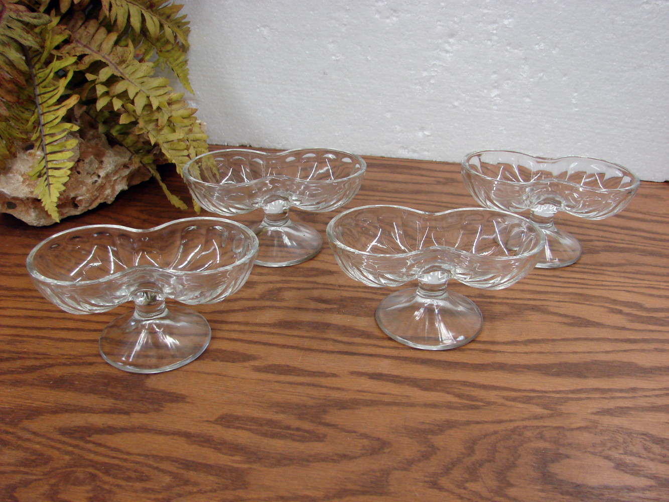 Vintage clear glass pedestal double scoop ice cream dishes. Measure about 6″ wide by 3 1/8″ tall. Free from damage. Not marked, unknown manufacturer.