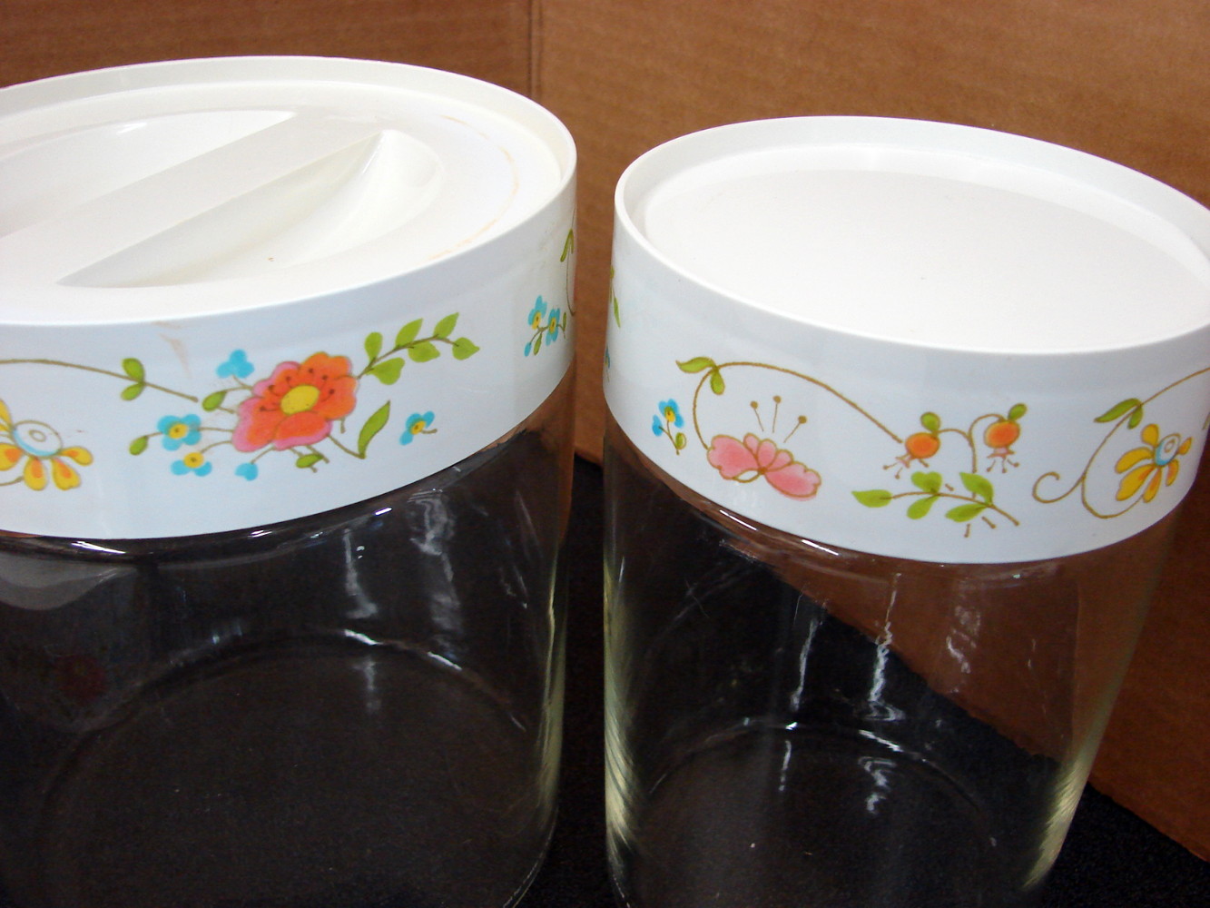 Vintage PYREX Corning Ware Corelle Wildflower pattern Set of four various sized PYREX glass canisters with plastic lids.