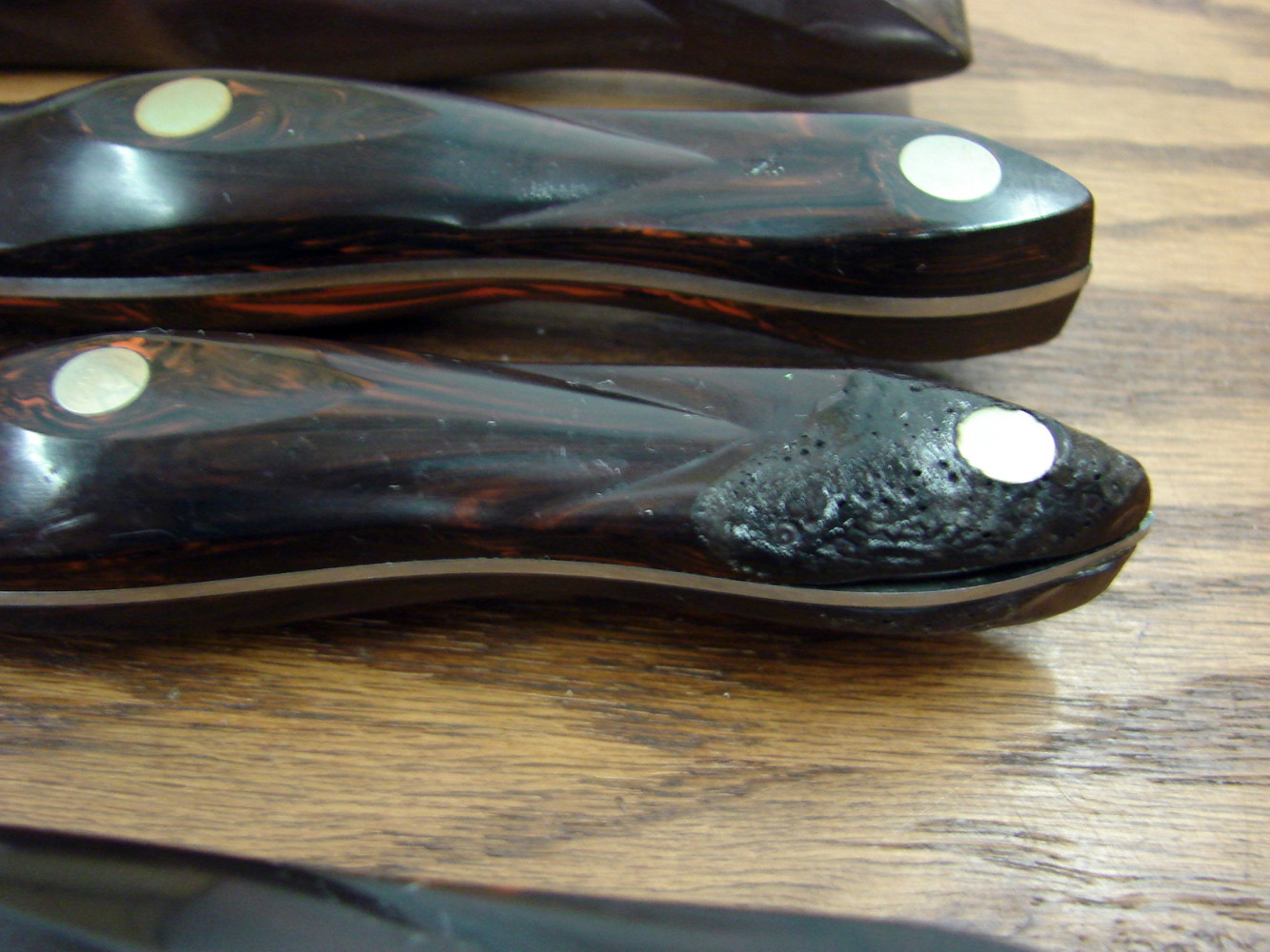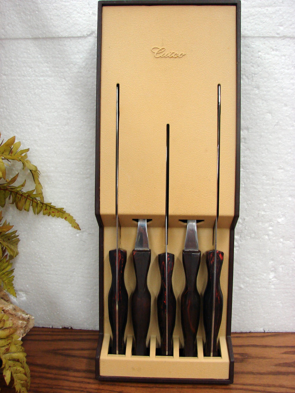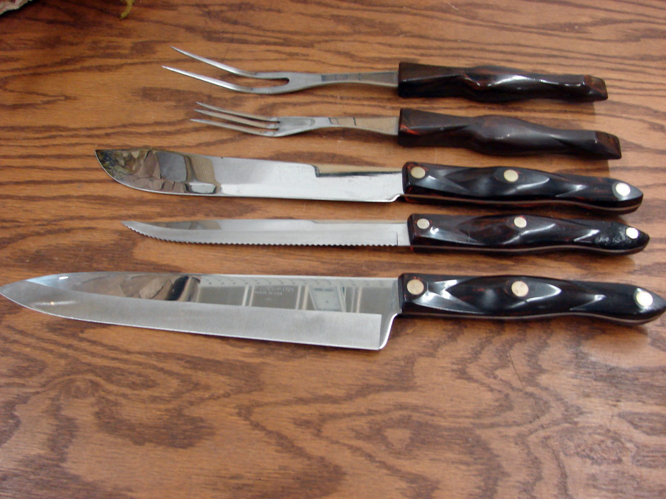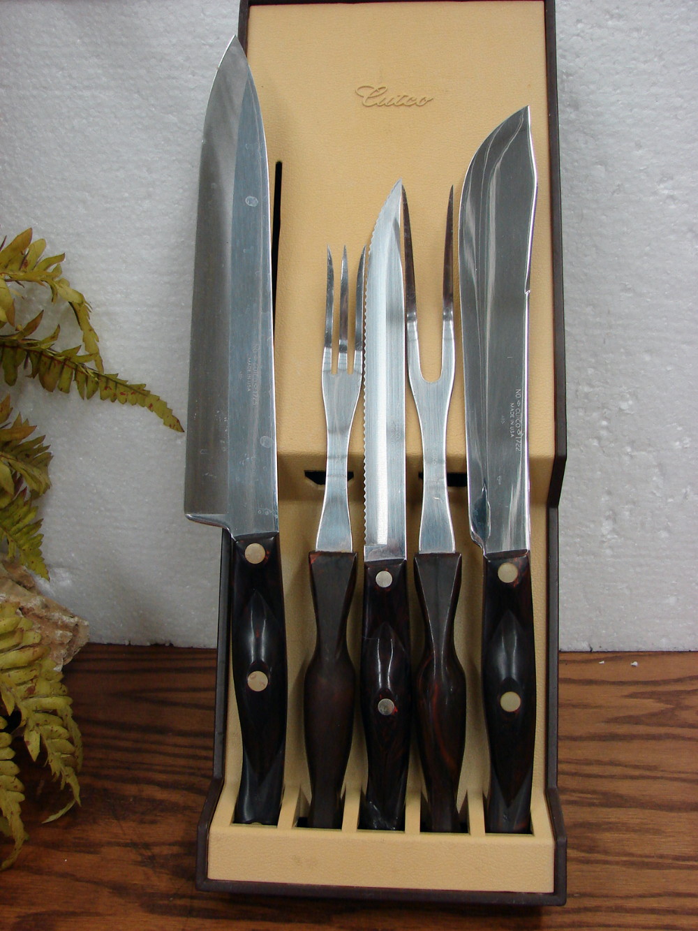 Set of five Cutco carving knives and forks includes 3 knives and 2 forks. The smallest knife has a melted end as shown and the largest knife has a very teeny tiny nick on the blade-you need your bifocals to see it. The White front of the wall hanging storage case has yellowed. An awesome set that still works perfectly.