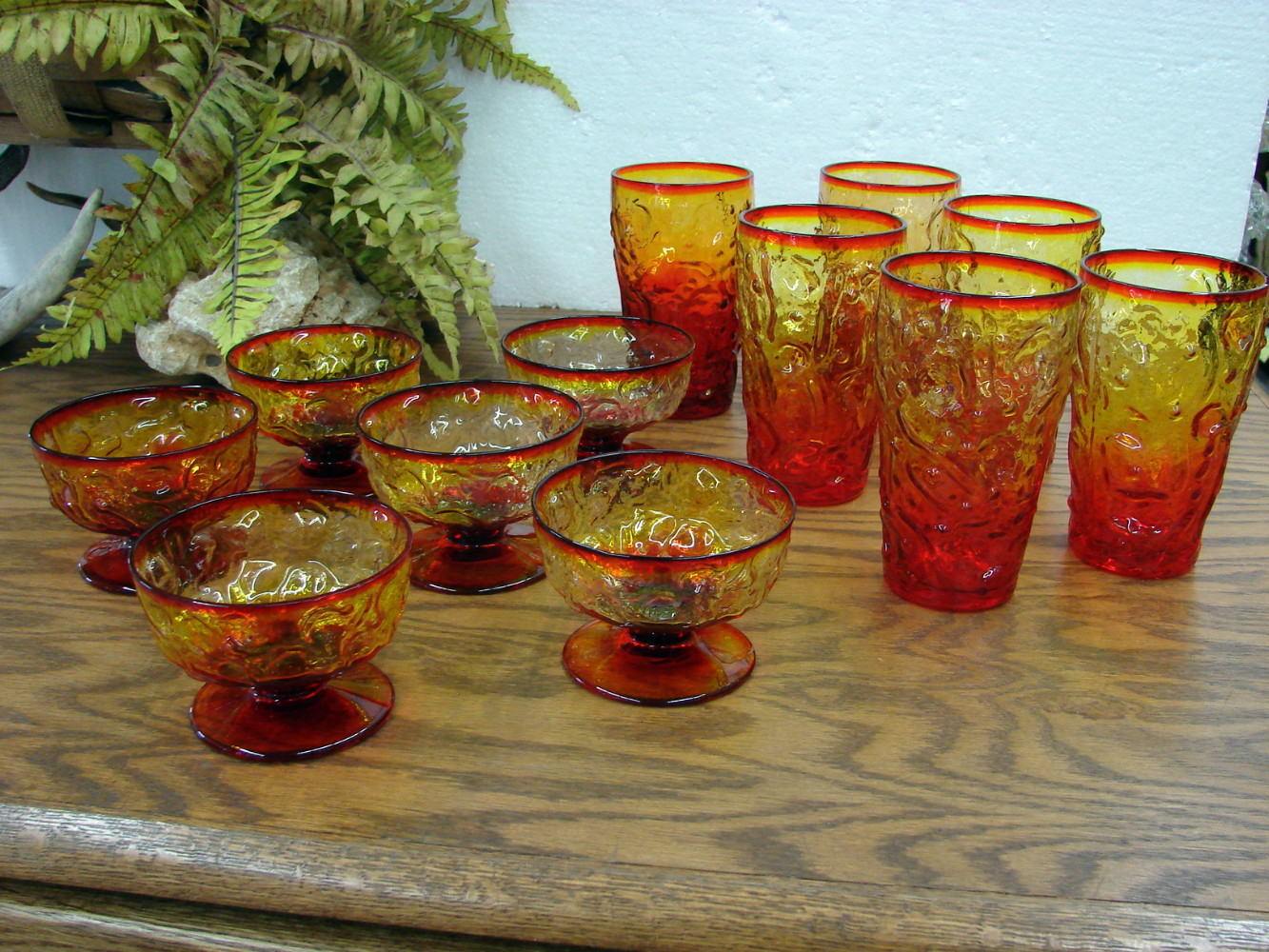 Set of 6 Vintage Bryce El Rancho Flame Amberina Glass Footed Sherbet Bowls. Measures about 2 3/4″ tall by 3 7/8″ wide. Free from damage. Highball Glasses also available.