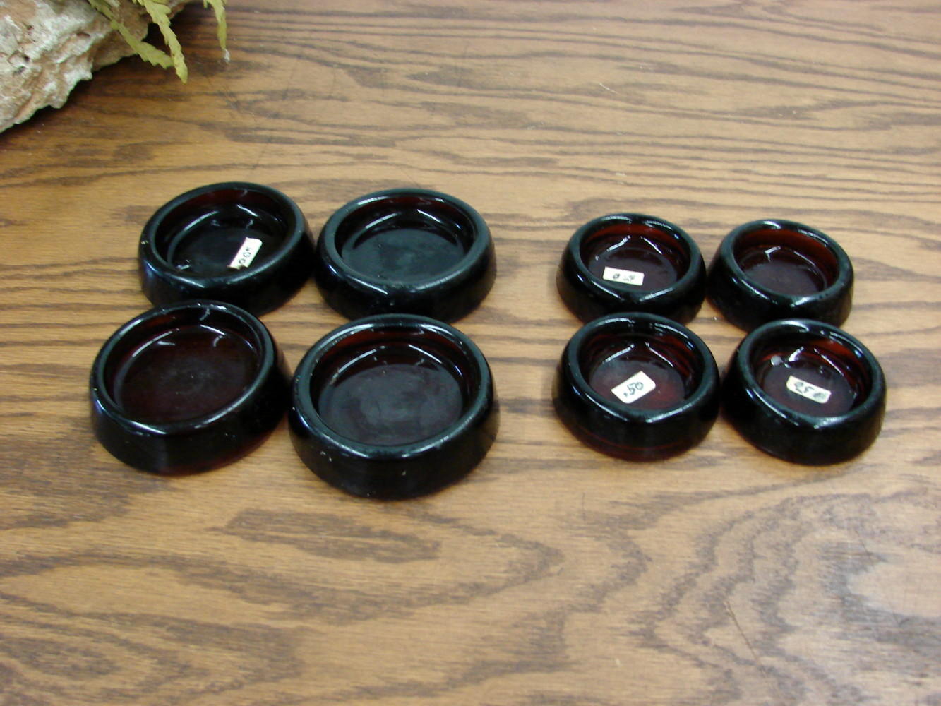 Vintage Anchor Hocking Glass Casters for furniture legs.  Includes 4 brown 3″ and 4 brown 2 1/2″.  Scratches from being used, no chips or cracks.