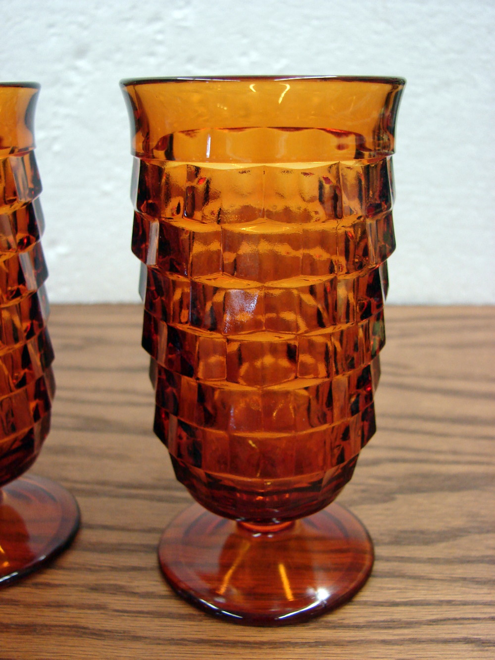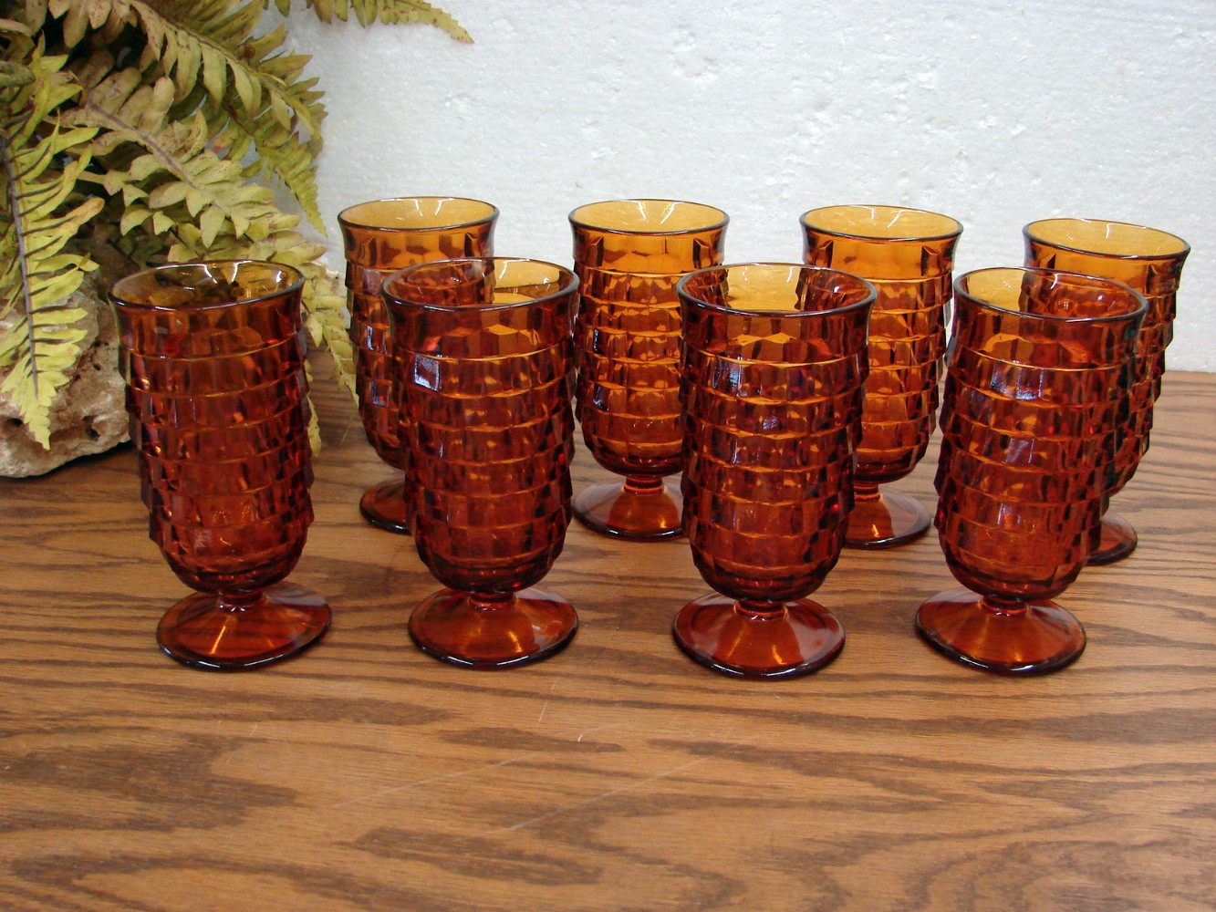 Gold Amber Cubist American Whitehall Indiana Glass Fostoria Footed Parfait Glasses, a Set of Eight.  Measure about 5 1/4″ tall. Free from damage.   Other Depression glass pieces also available.