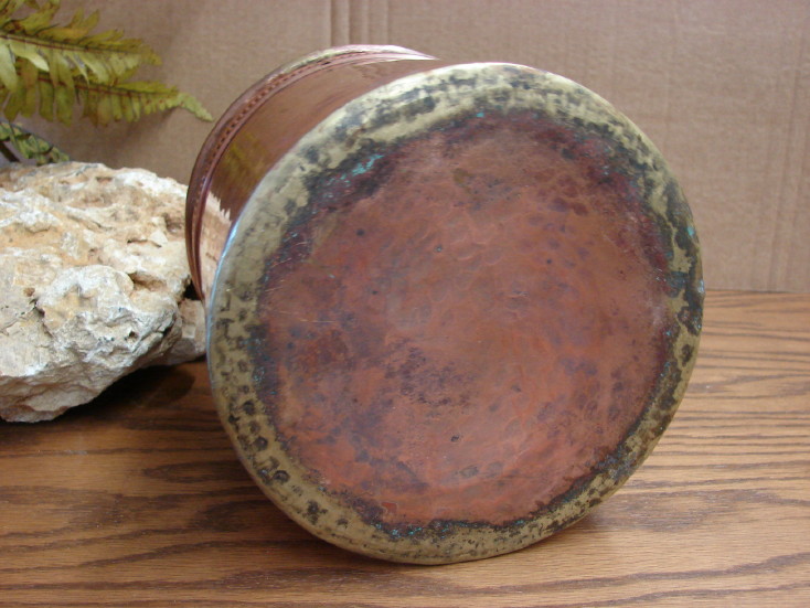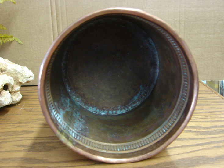 Large copper straight sided planter basket would make a great plant pot cover or small basket.   Weighs about 1 Pound 5.30 Ounces and measures about 6 1/4″ x 6 1/2″.  Any dings and dents are included free of charge.
