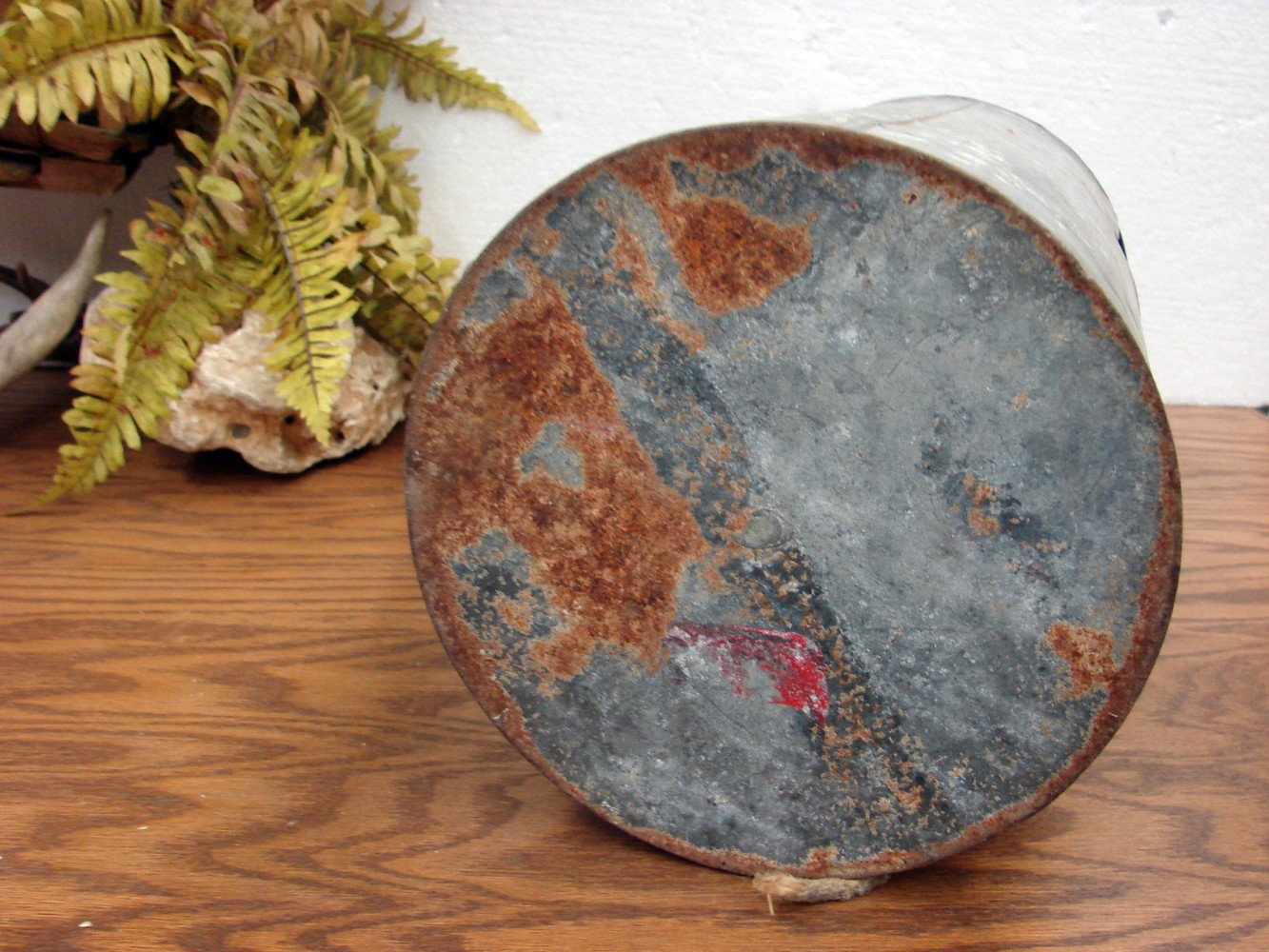 Very cool 93 year old Torpedo Rocket Shaped Pull Behind Minnow Bucket.    Stamped “Automatic Minnow Pail” “something something can’t read 1933”.   Spring loaded door with screen on the other side and handy grab handle.  Loop at top to tie rope.  Measures about 24″ long by 8 1/2″ wide.  Some minor dings and door does sit shut flush, but the spring is still good.    Other old minnow buckets also available.