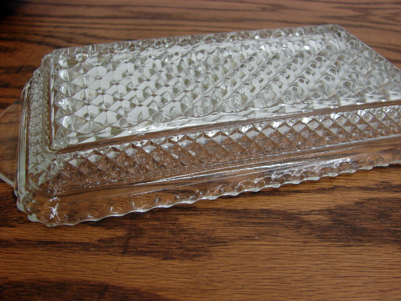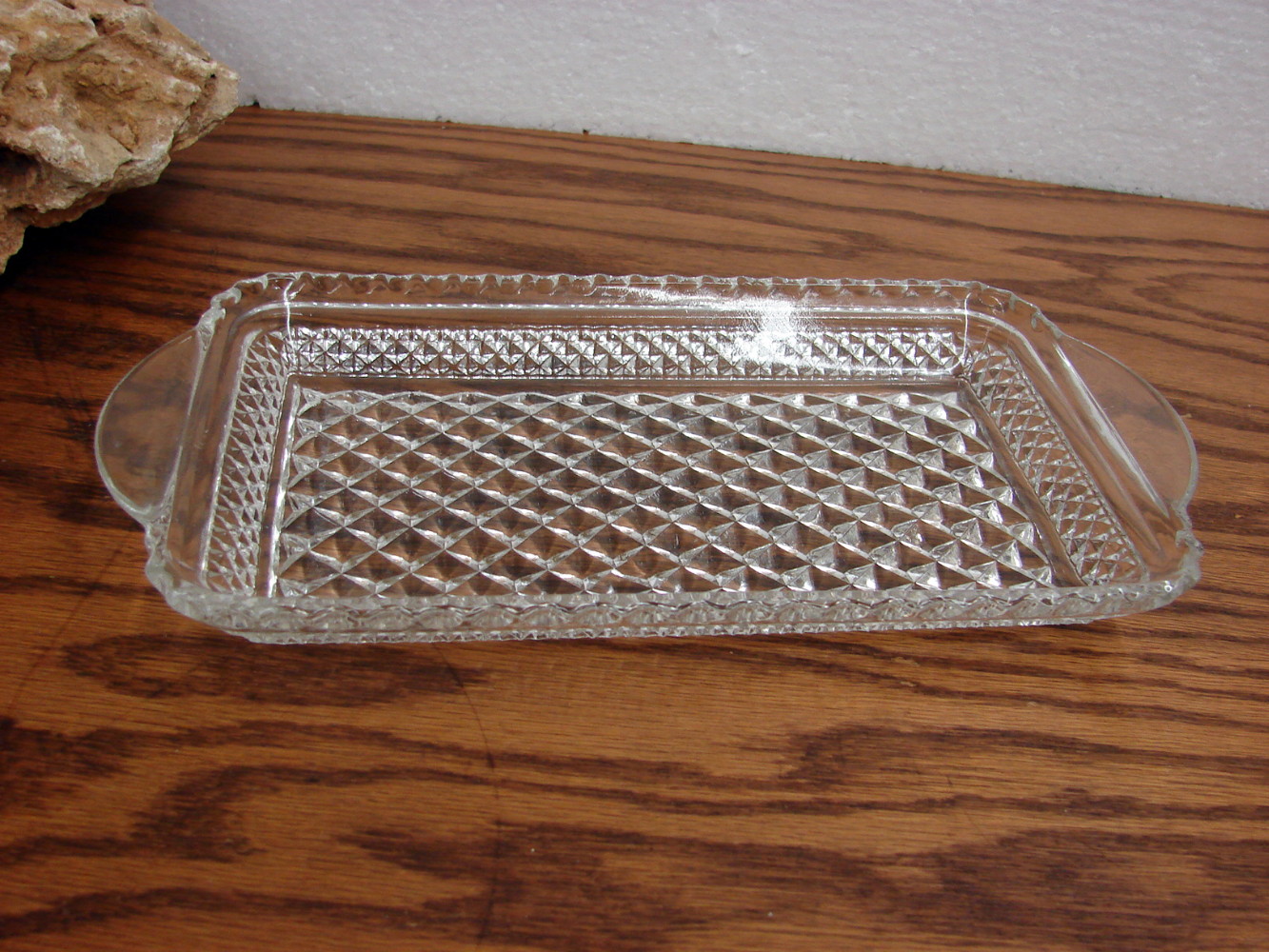 Gorgeous Wexford pattern Rectangular Cream and Sugar, Cranberry and/or Relish Tray. Measures about 9 3/4 x 5 1/4″. Free from damage. Many other styles in this pattern also available.