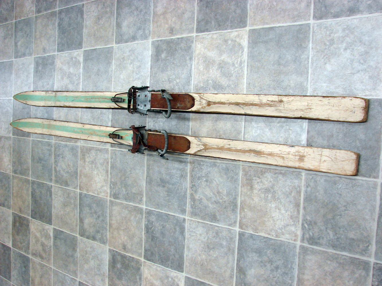 Vintage Blue Stripe Wood Snow Skis Hawi Wooden Wall Hangers w/ Bindings