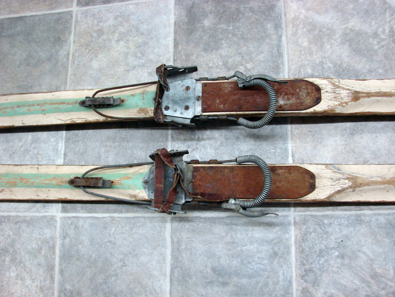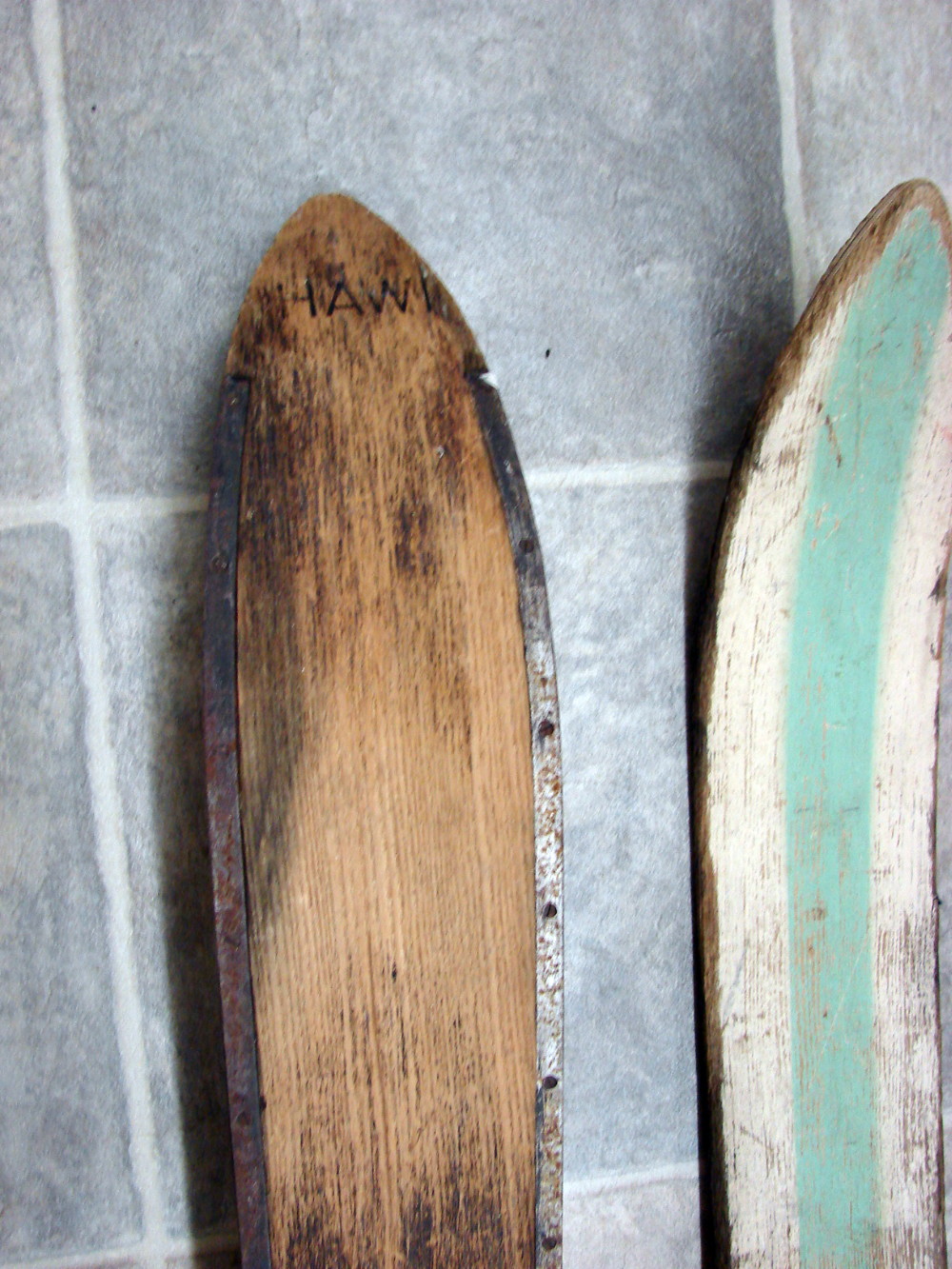 Vintage Blue Stripe wood snow Skis that measure about 80 1/2″ long and are about 3″ wide. Domed with iron edge. Unique blue stripe on white paint. Bindings still in tact and are marked Hawi on tip.