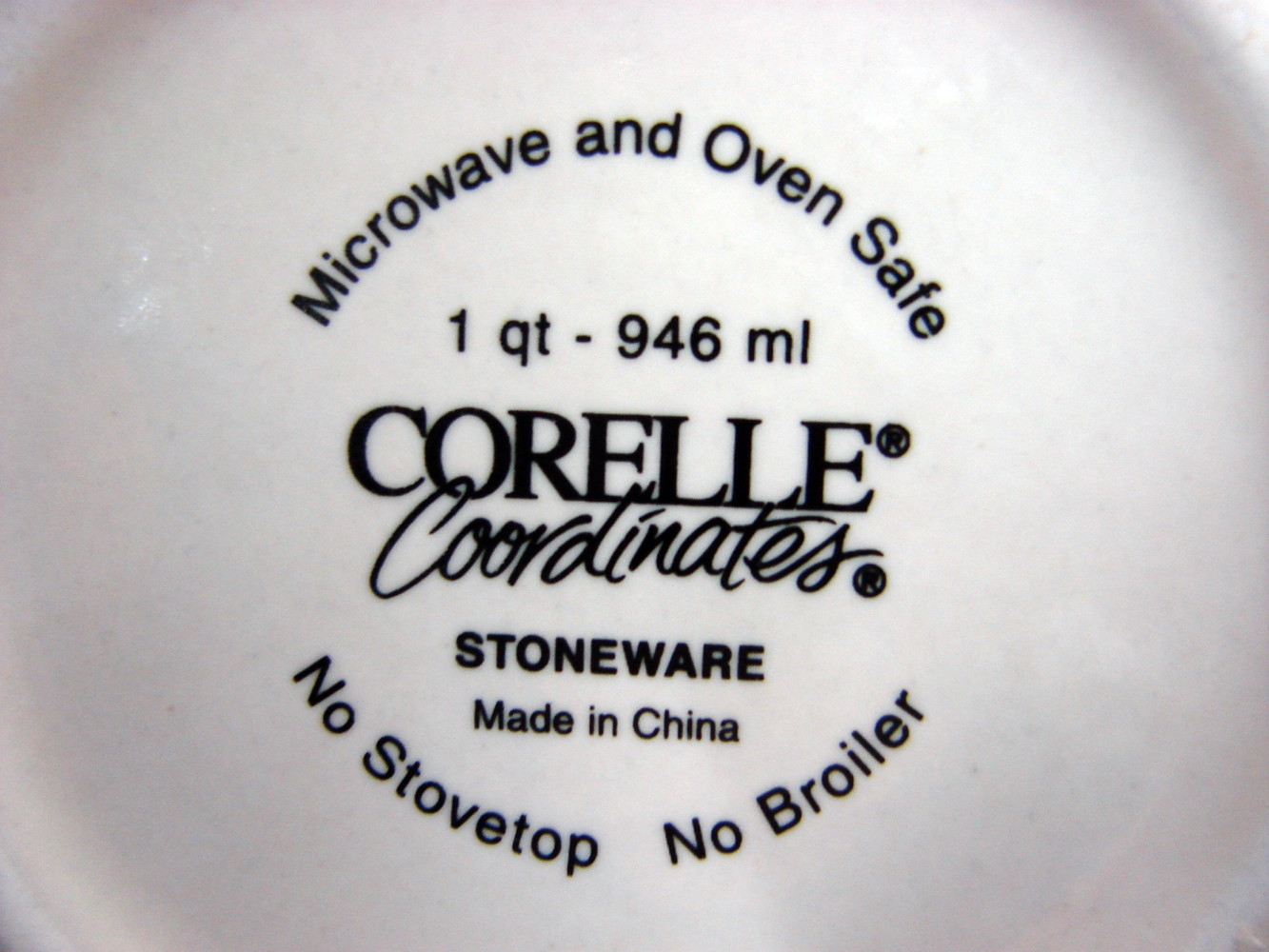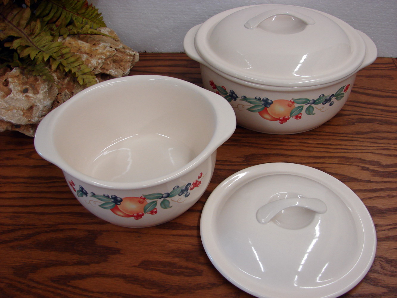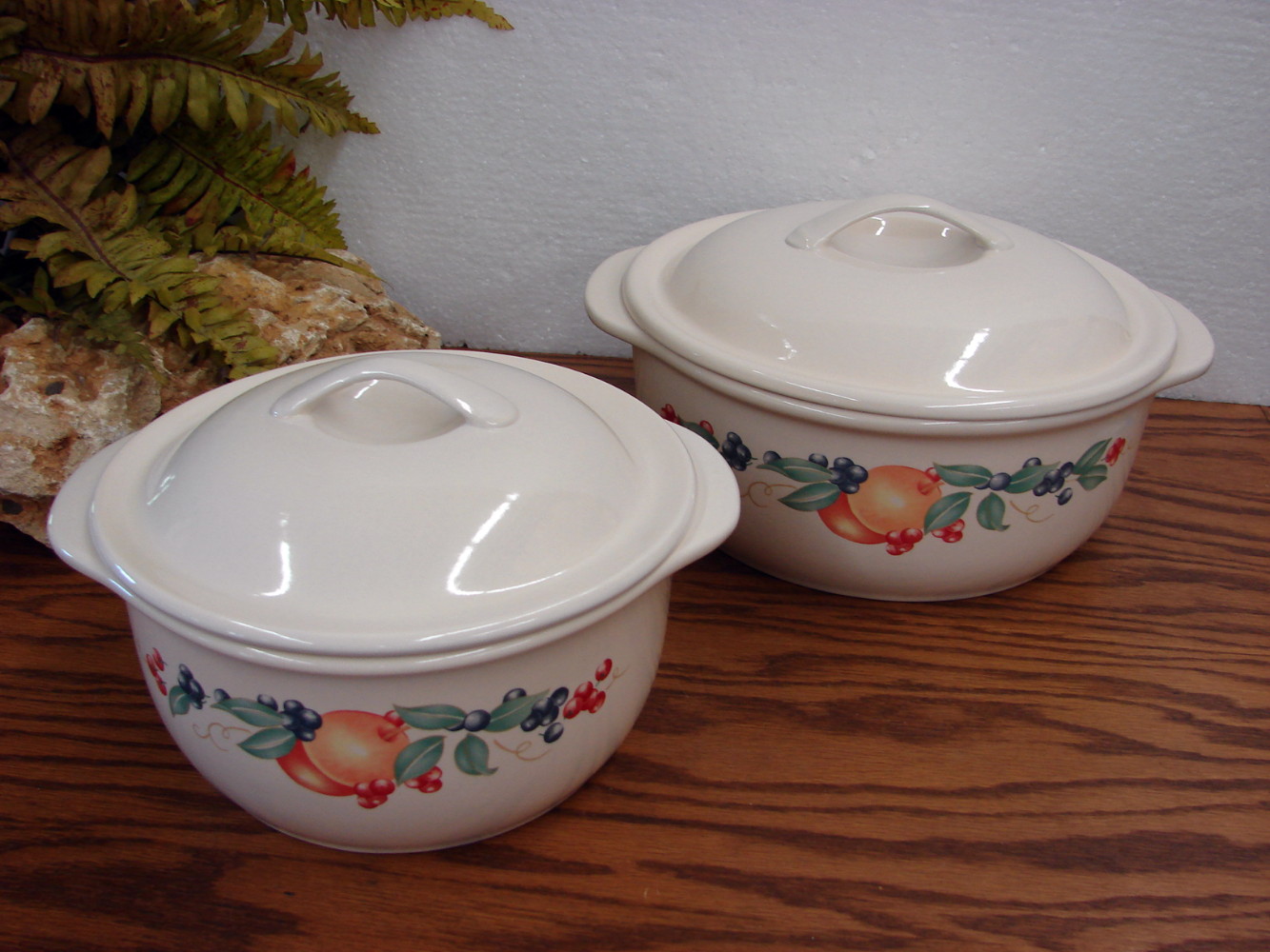 Vintage Corning Ware Corelle Abundance Fruit pattern Stoneware Round Bulbous Covered Casserole. This one is the 2 1/2 Qt with lid. Free from damage. Many more options in this pattern also available.