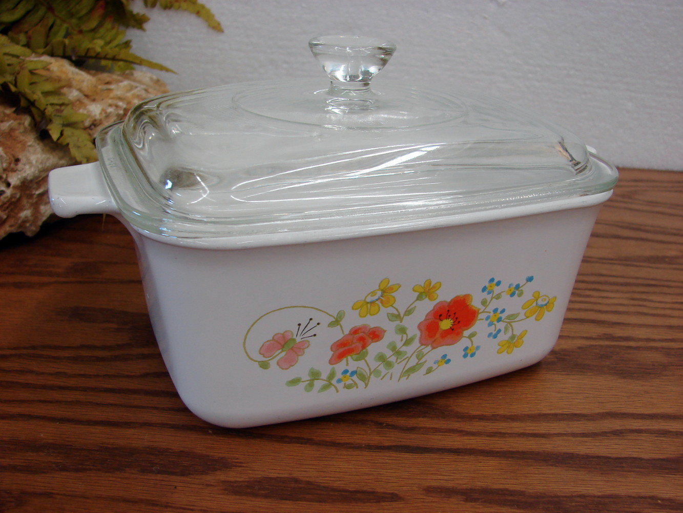 Vintage Corning Ware Corelle Wildflower pattern P-4 Small Loaf pan w/ PYREX lid. Measures about 7 x 5 1/2 x 3″. Free from damage. Many more options in this pattern also available.