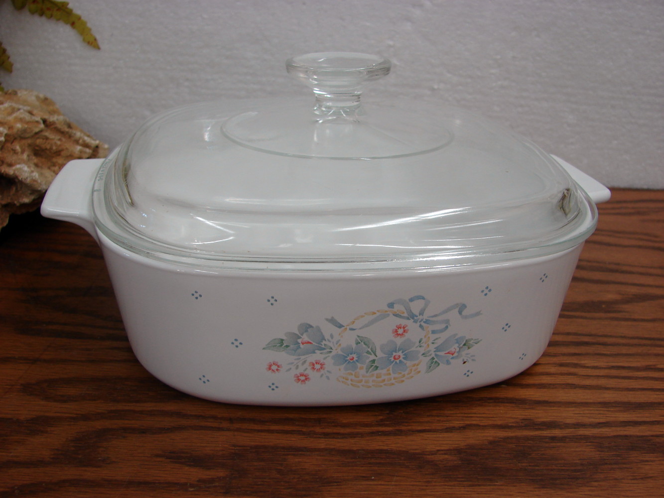 Corning Ware Corelle Country Cornflower Flower Basket Design on a 2 Liter Casserole with PYREX Lid. Free from damage. Other options in this pattern also available.