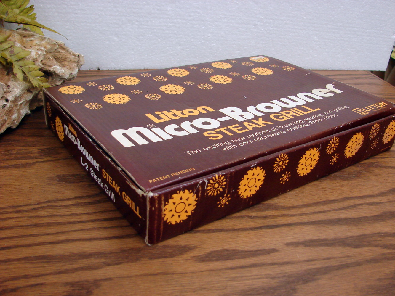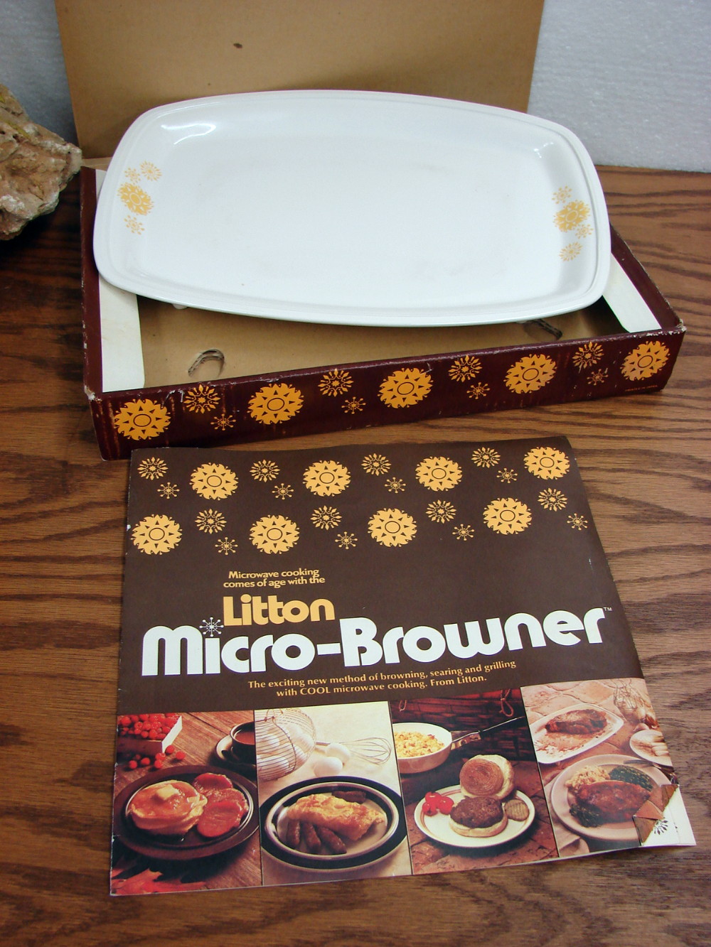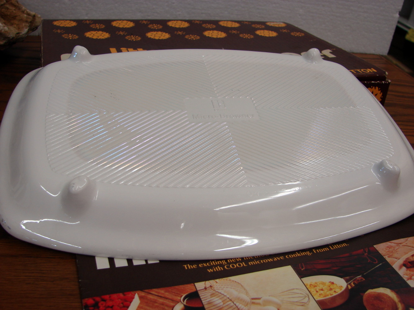 Vintage White Corning Ware Microwave trays designed to brown and sear food. Use for meats, sandwiches, etc. Awesome for wanting quick and still have browned food from your Microwave. This one is the Litton Micro-Browner Steak Grill with Butterfly Gold type pattern on both ends. Measures about 11 1/4 x 8″ with recipe instruction book. Very light staining. More options/sizes also available.