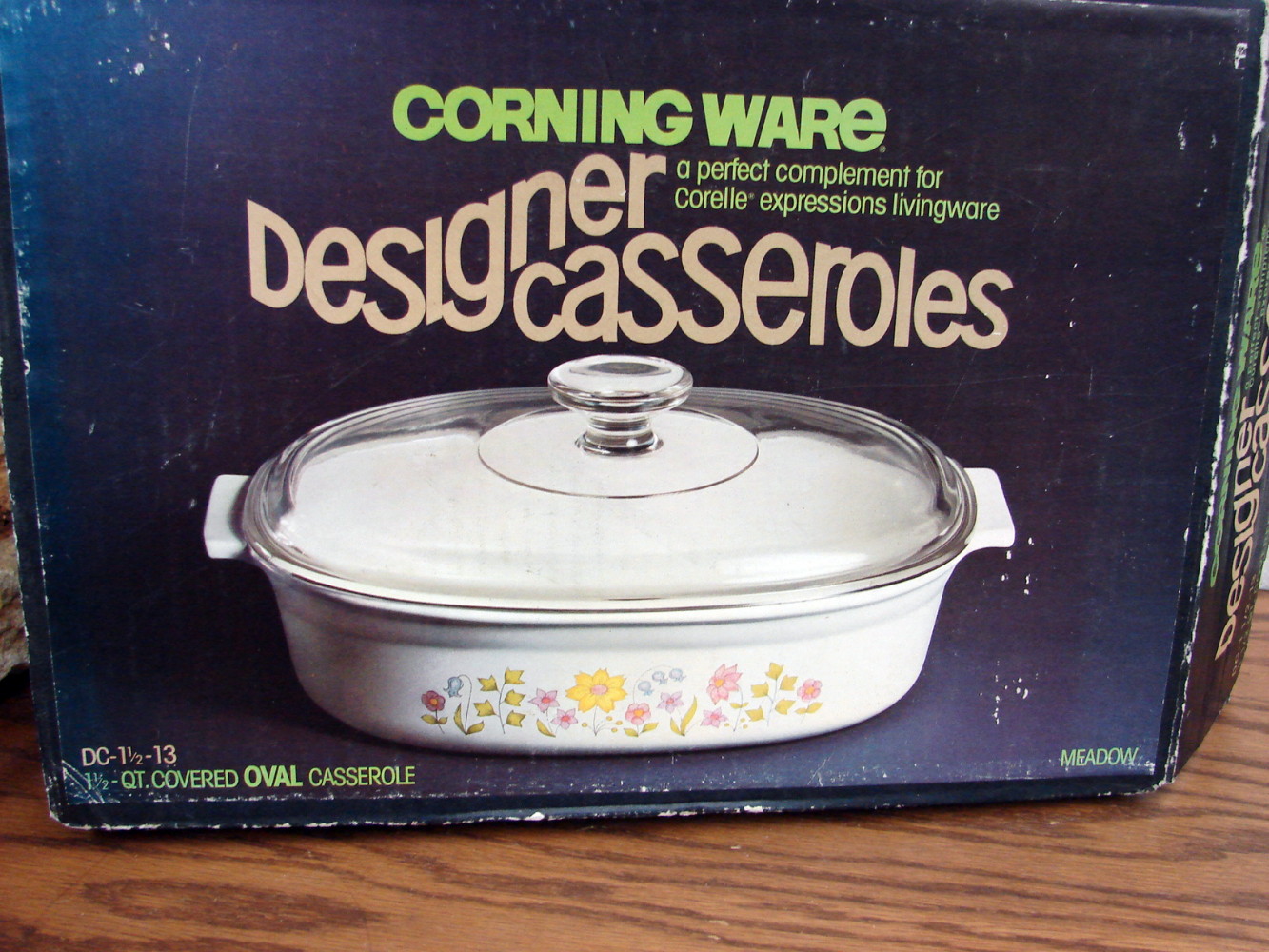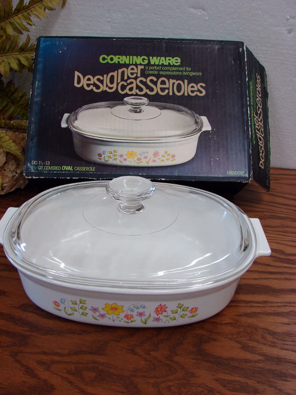 Brand New Corning Ware Corelle “Meadow” Oval Casserole w/ PYREX Lid in original box.   Free from damage.  Holds about 1 1/2 Quarts.   Other options in this pattern also available.