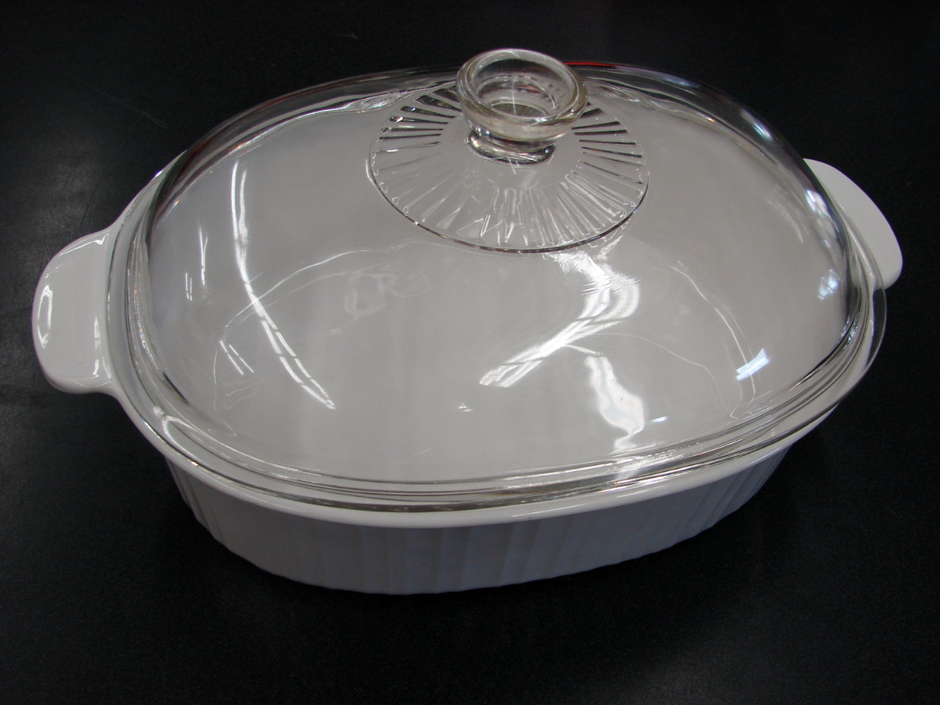 Corning Ware French White pattern Bake Microwave Serve and Store.  Oval F-14 holds about 4 Ltr w/ Clear Glass Pyrex Lid.  Free from damage.    Many more options in this style also available.