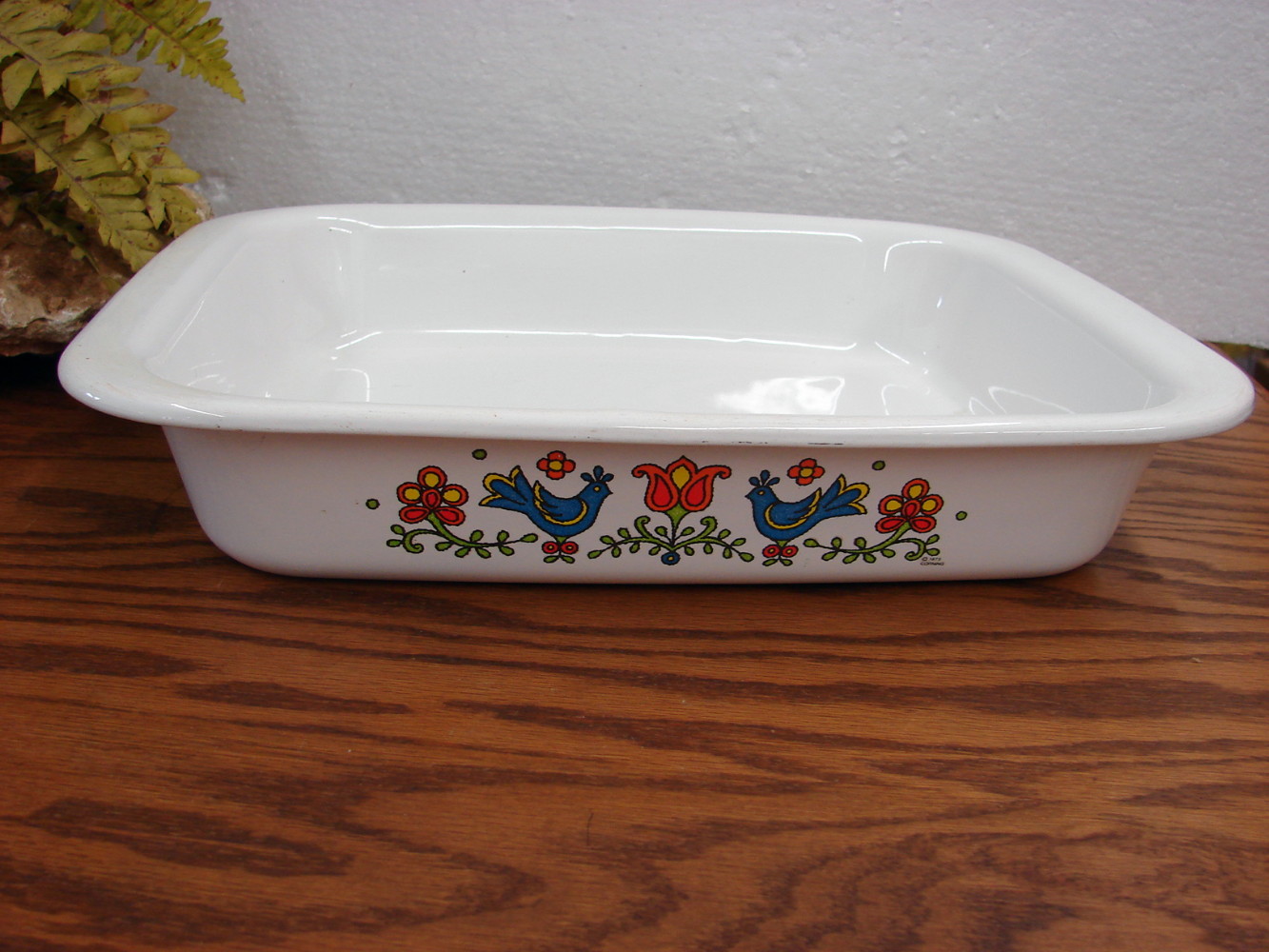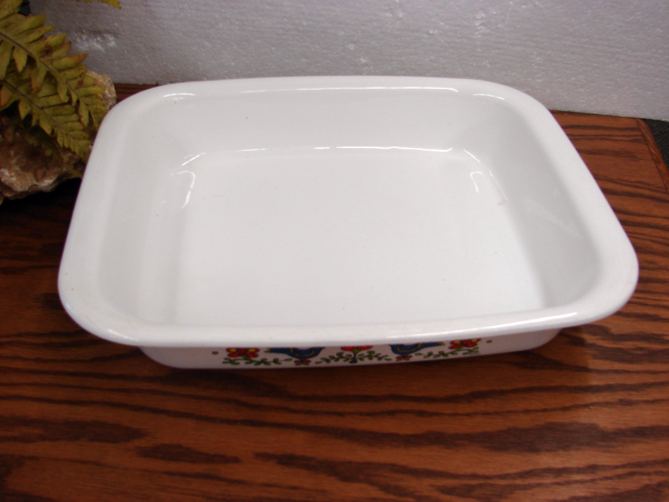 Vintage Corning Ware Corelle Country Festival Rooster Blue Bird Tulip pattern.  This one is the A-21 Open Roaster Lasagna Pan.  Measures about 12 1/4 x 10 1/4 x 2 1/4″.   Free from damage.  Many more options in this pattern also available.