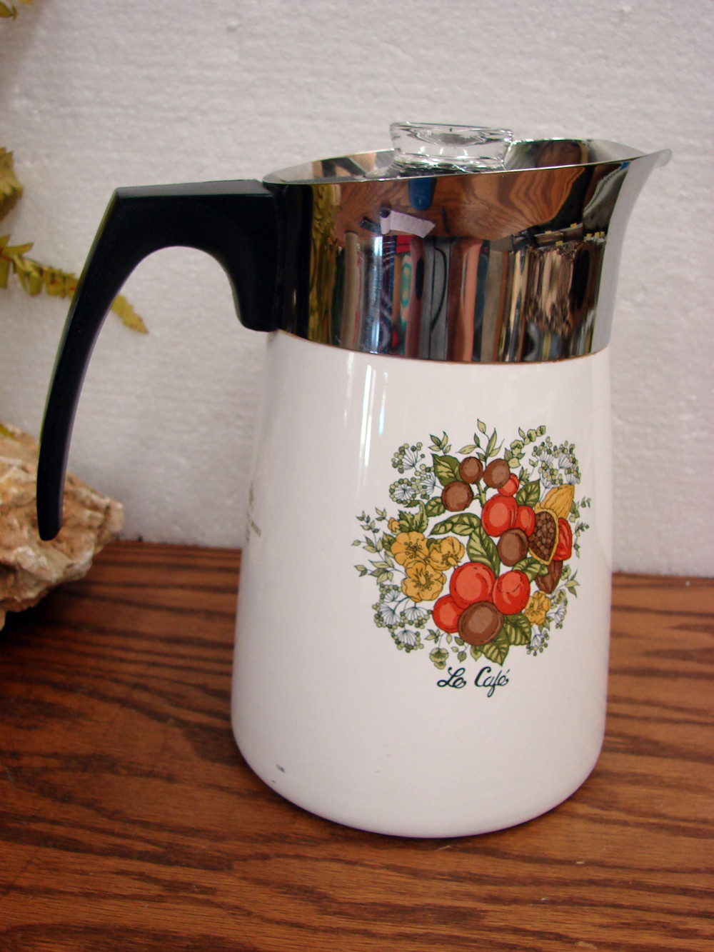 The all American Vintage Kitchen Accessory! Vintage Spice of Life pattern by Corning Ware Made in USA. Previously enjoyed and free from damage. #146 Stove Top Coffee Percolator that makes about 6 Cups. Tested and working, missing top filter. More than 50 other variations of Corning Ware Spice of Life Kitchen accessories available.