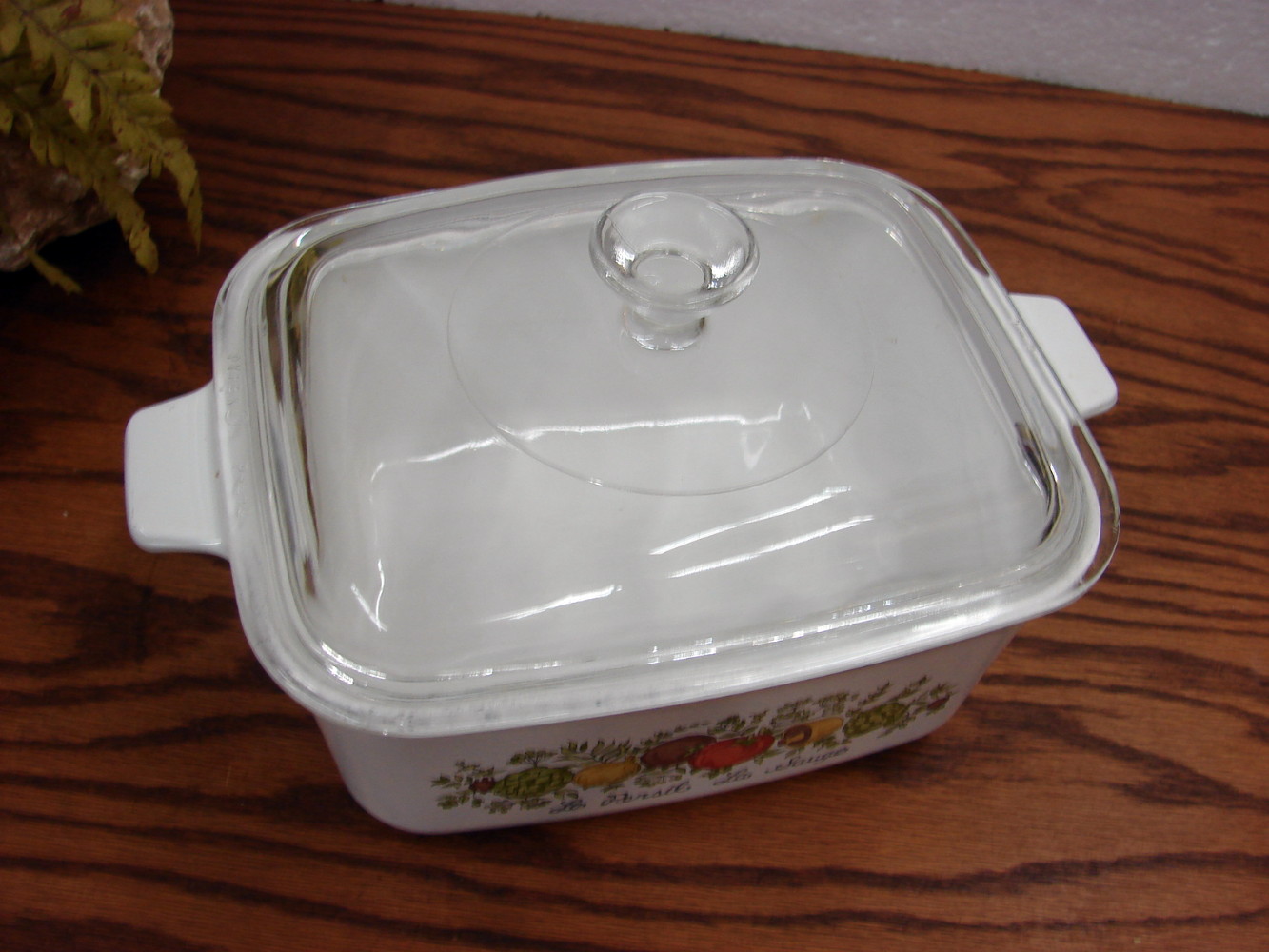 The all American Vintage Kitchen Accessory! Vintage Spice of Life pattern by Corning Ware Made in USA. Previously enjoyed and free from damage. P-4 lidded small rectangular pan with glass PYREX lid measures about 7 x 5 1/2 x 3″. More than 50 other variations of Corning Ware Spice of Life Kitchen accessories available.