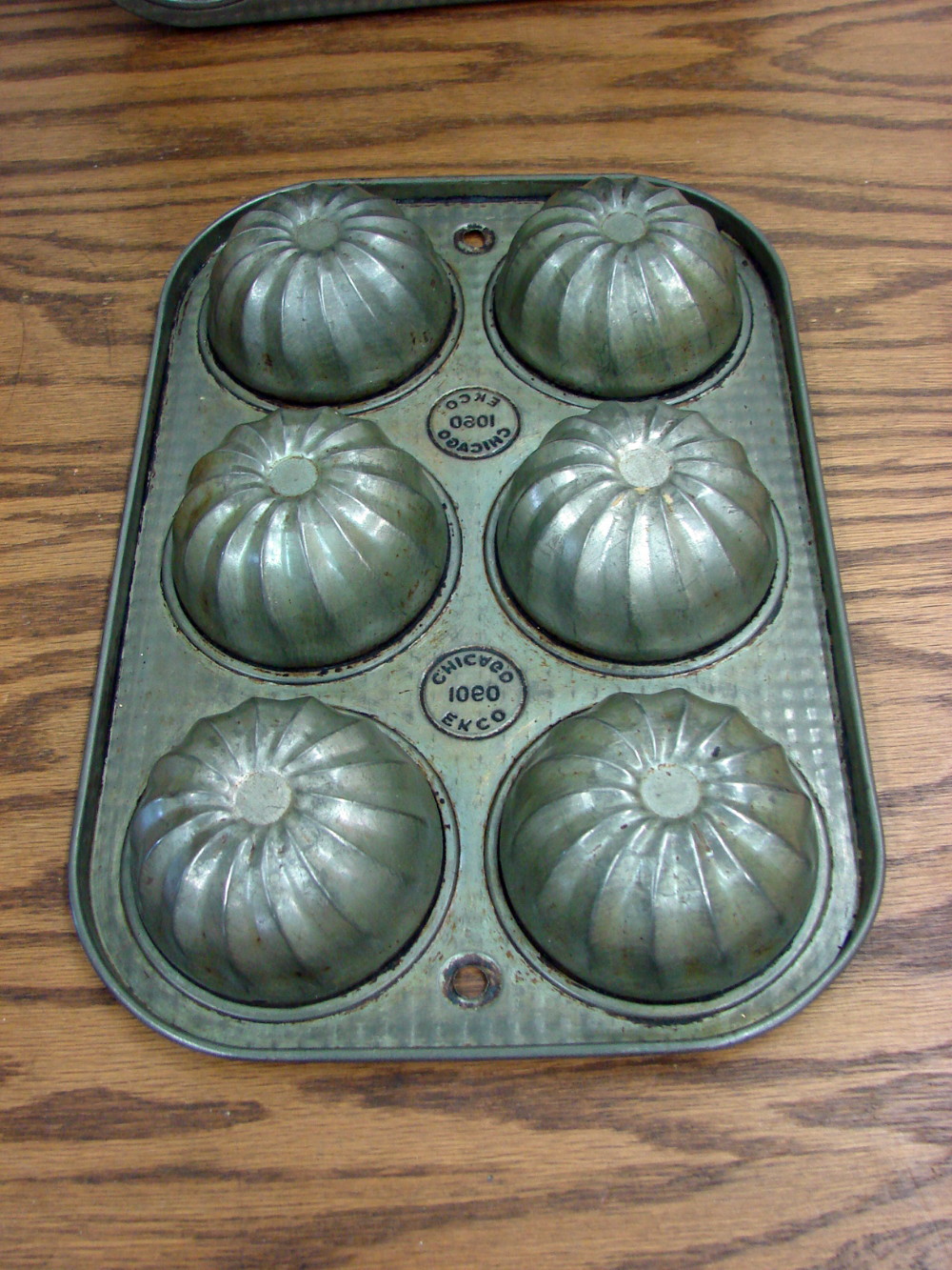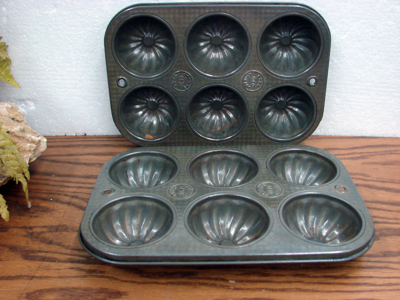 Set of 2 Cool vintage Plaid patterned Ekco Mini Bundt pan that looks like little pumpkin molds. Each measures about 10 1/2 x 7 1/4 and hold 6. Will need to be cleaned up, or display as they are.