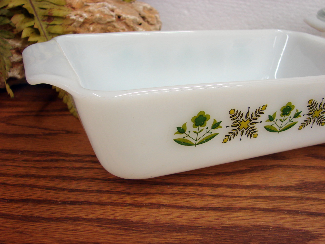 Vintage Fire King White glass Anchor Hocking Meadow Green pattern for your retro kitchen. This is the #441 Bread Loaf Pan baking dish that holds about 1 quart. Free from chips cracks or repairs. Other styles in this pattern also available.