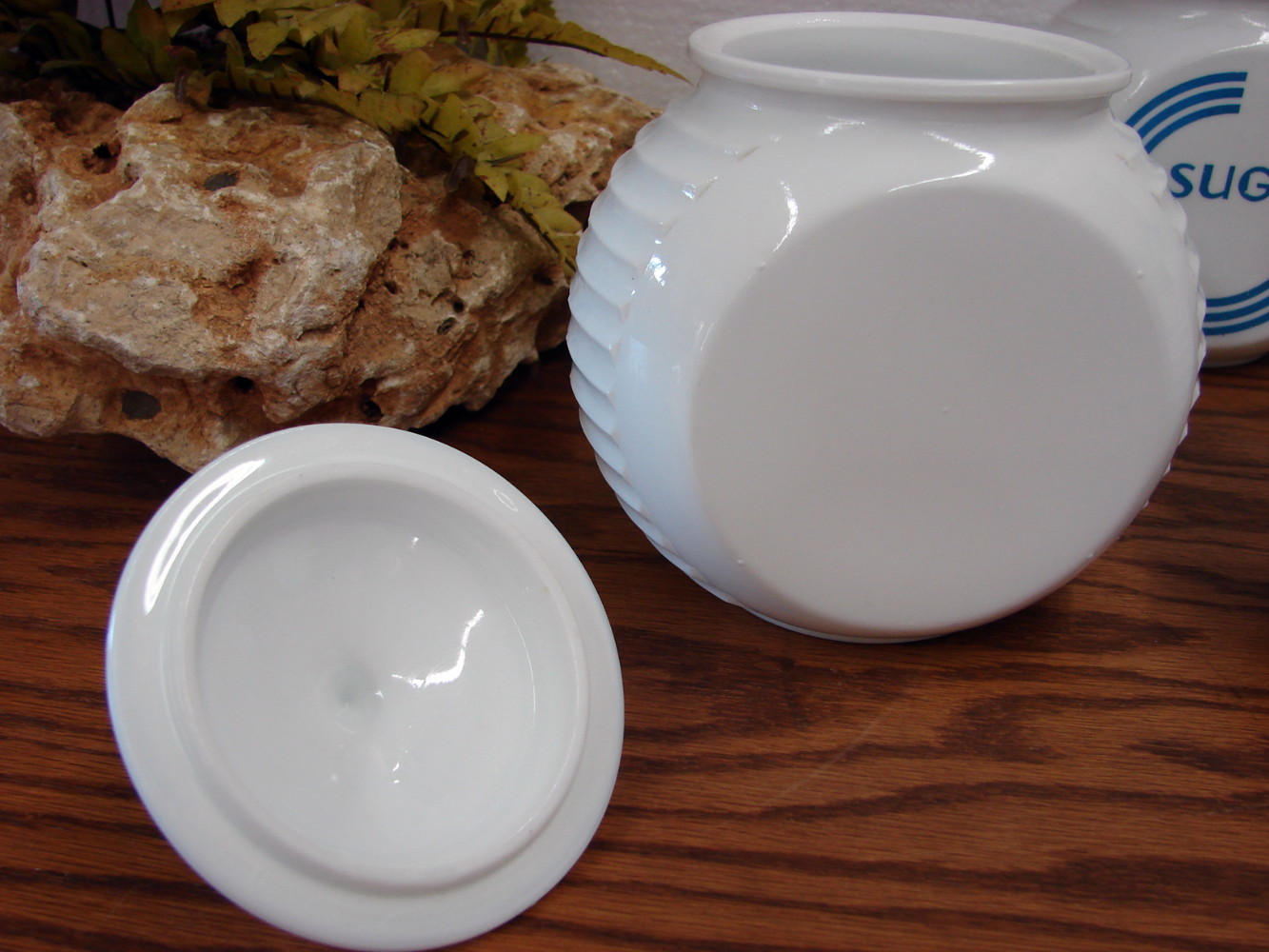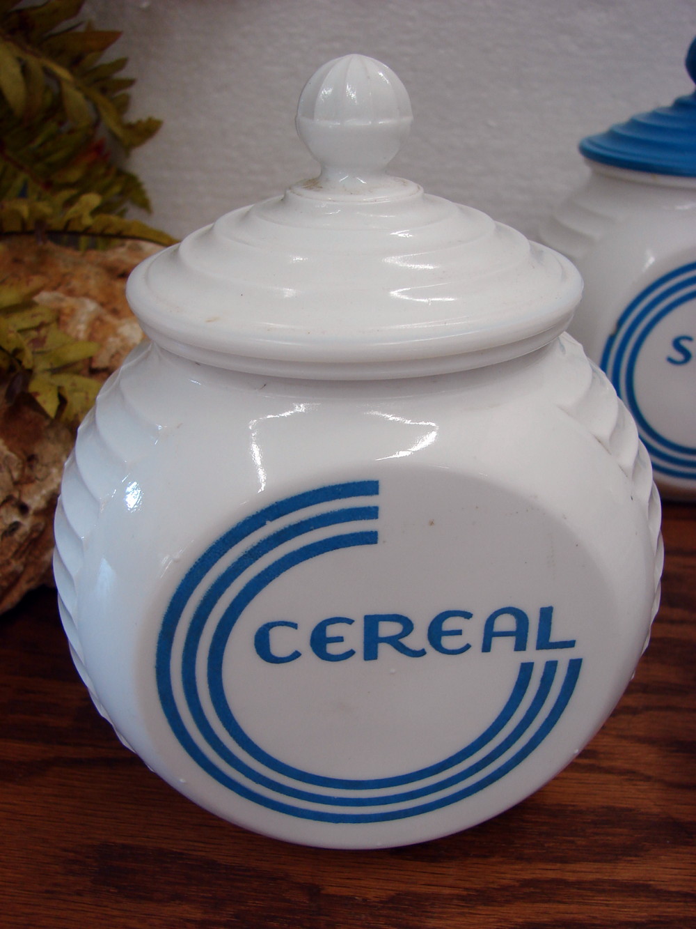 Vintage Fire King Anchor Hocking Milk Glass Blue Circle Vitrock Large Canister for “Cereal”. Measures about 6 x 5″ and is free from damage.