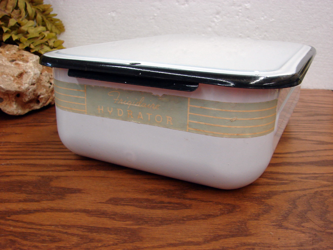 Vintage Frigidaire Hydrator Refrigerator Box Drawer w/ Lid Black White Enamelware Label