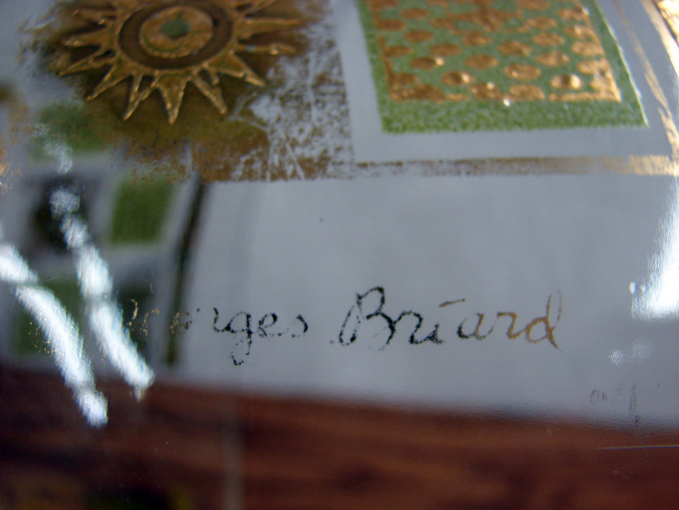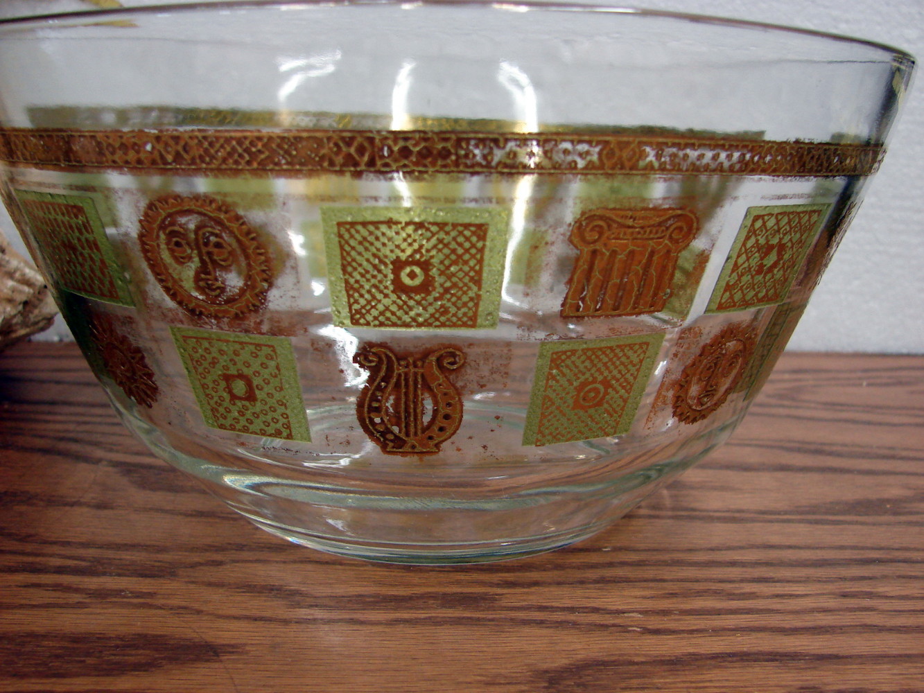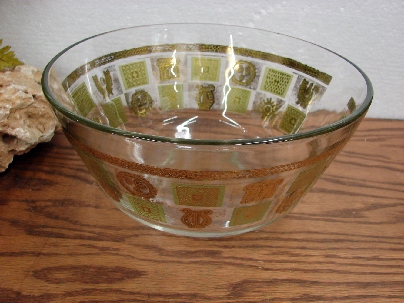 Vintage signed Georges Briard oversized bowl with Green and Gold pattern. Measures about 10″ wide by 5″ tall. Wear on pattern, still displays nice and is perfect for use. No structural damage.